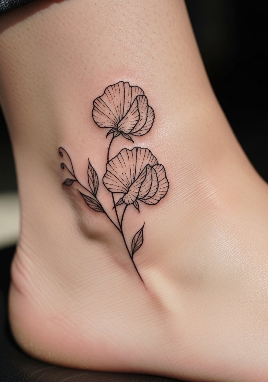 I got one like this as a test run. The ankle is bony and it hurts in short sharp bursts. Minimalist single-stem sweet peas read elegant when placed on the medial ankle. Session time: 20 to 40 minutes. Many people make them too tiny, and finger-to-ankle movement plus shoes cause early fading. I recommend slightly larger line weight and ask the artist to avoid single hairlines where the stem meets the flower. Healed at six months this style needs yearly sunscreen and occasional balm to stay bright. For daily showers I used mild castile soap to keep the area clean without stripping oils. Dr. Bronner's Unscented Castile Soap