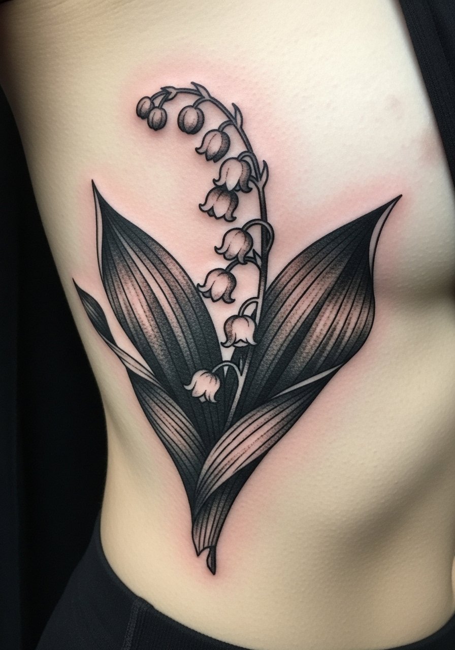 I first saw this on an artist's portfolio and loved the contrast of tiny bells with heavy black leaves. Blackwork hides aging well because solid black ages into darker gray rather than spotty fade. That helps on ribs which experience occasional stretching. Expect higher pain than the upper arm. Session time depends on fill area. Tell the artist you want clean negative space between the bells so the silhouette stays readable. A mistake I see is packing too many tiny dots into the bells. Those go soft at one year. Aftercare is the same as other large pieces, but give it two full weeks of gentle care before heavy lifting.