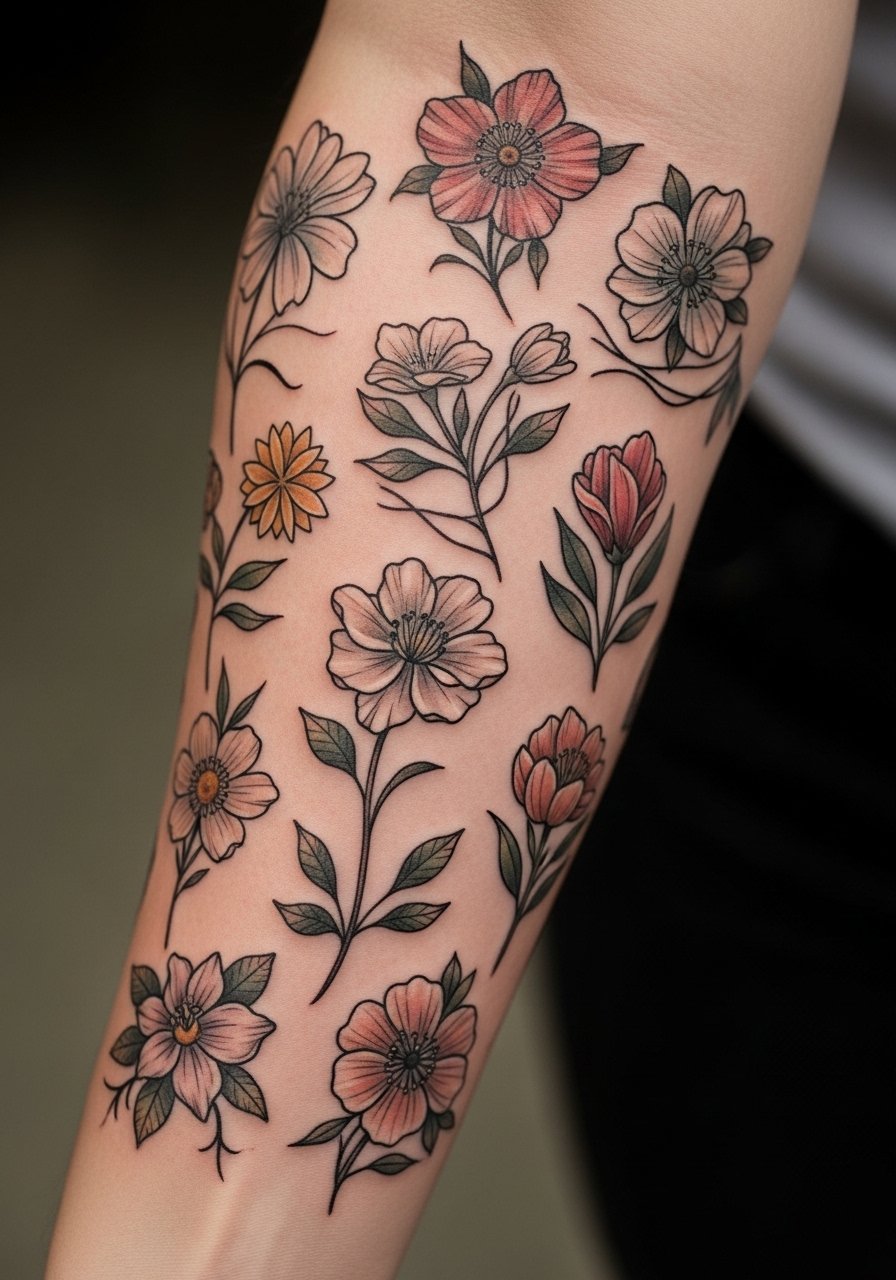 9. Botanical Sleeve With Birth Flowers On Inner Forearm