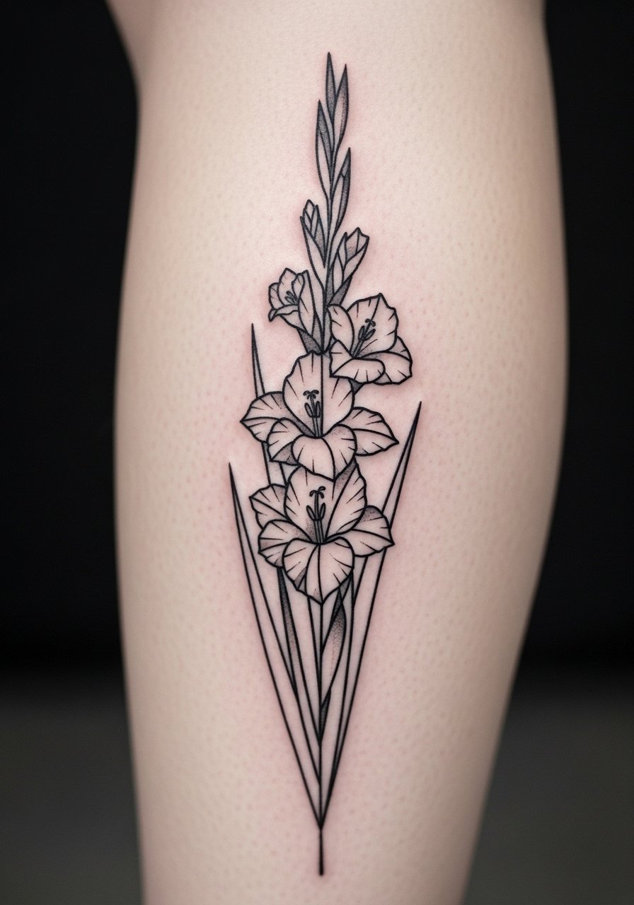I saw this at a convention. The pairing of rigid geometry with vertical gladiolus makes a dynamic calf piece. Calf pain is moderate. A 1 to 2 hour session can create a bold rhythm. The trick is spacing. I tell clients not to compress the gladiolus petals into tiny compartments inside shapes. That causes blurring. Ask your artist to draft the geometry over the calf muscle in different positions so you can see how it looks during movement. After healing, the black geometry will soften but remain legible if given clean negative spacing.