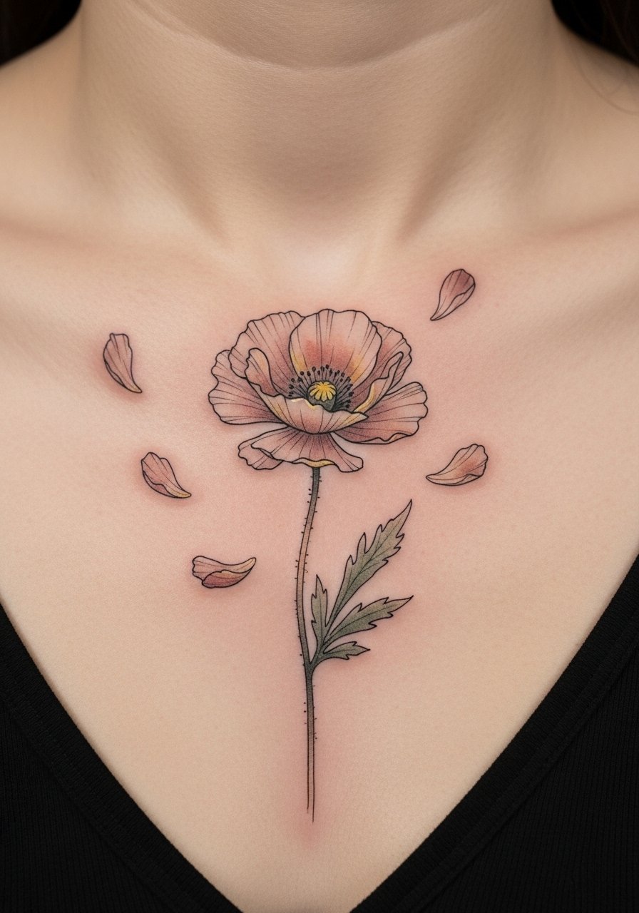 Sternum work can be intense. Pain is high for many people. A delicate poppy here reads intimate and symbolic for an October person. Session time depends on size, but a small central poppy is 45 to 90 minutes. The common mistake is asking for ultra-thin details across ribs. Those blur quickly with chest movement. I prefer slightly bolder edges near the base so the flower keeps its silhouette. Healed at six months the poppy is softer. Keep upper chest clothing loose while healing to avoid scabbing issues.