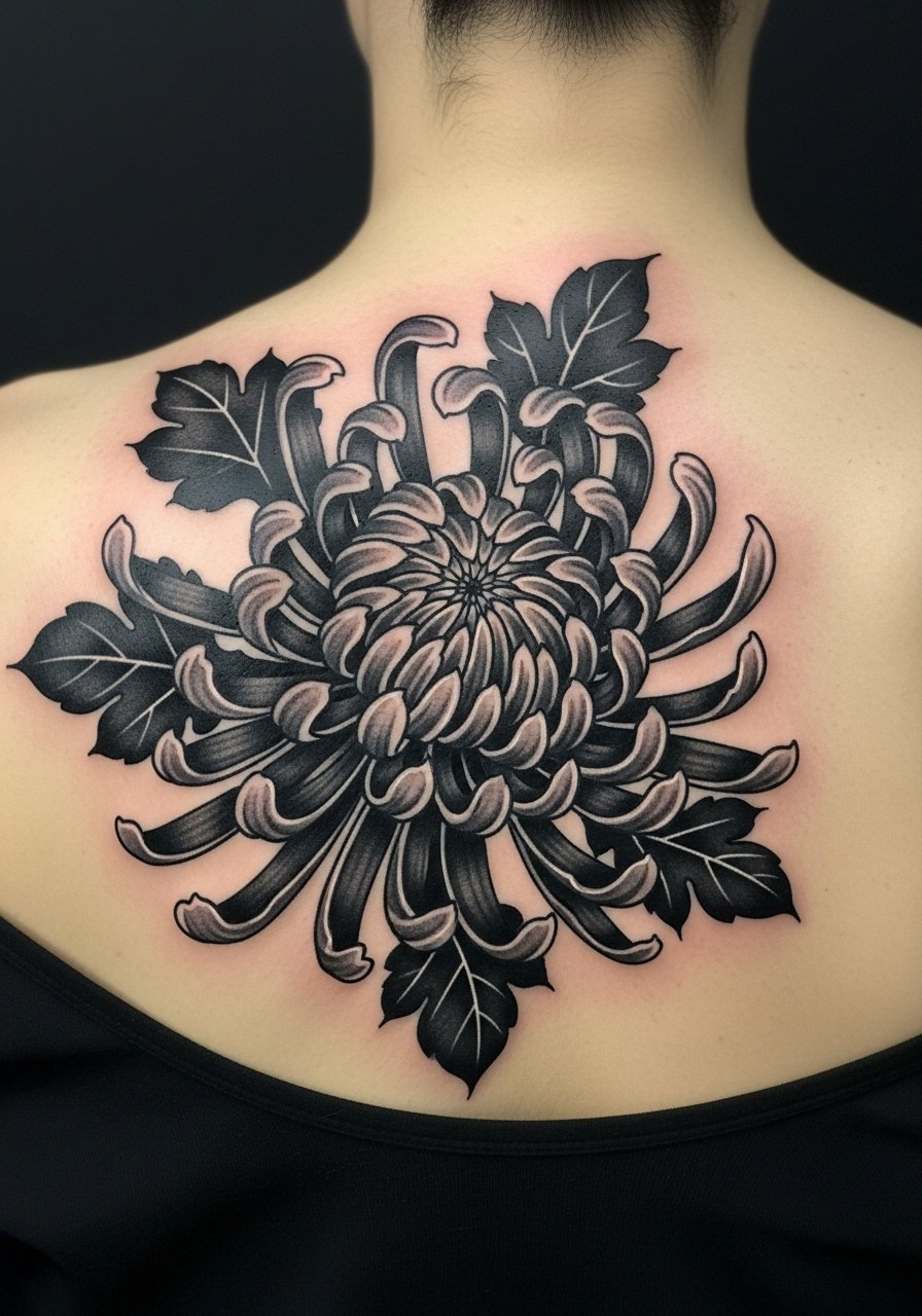 Big back pieces allow dramatic composition. I recommend bold black chrysanthemums for November symbolism. Pain is manageable across the back. Sessions can be long. For longevity pick dense black fills and avoid tiny stipple in key petals. I tell clients to plan this as a multi-session commitment. When healed the petals form strong silhouettes. A common mistake is crowding too many blooms into one spot. Give each flower room to age into its own shadow.