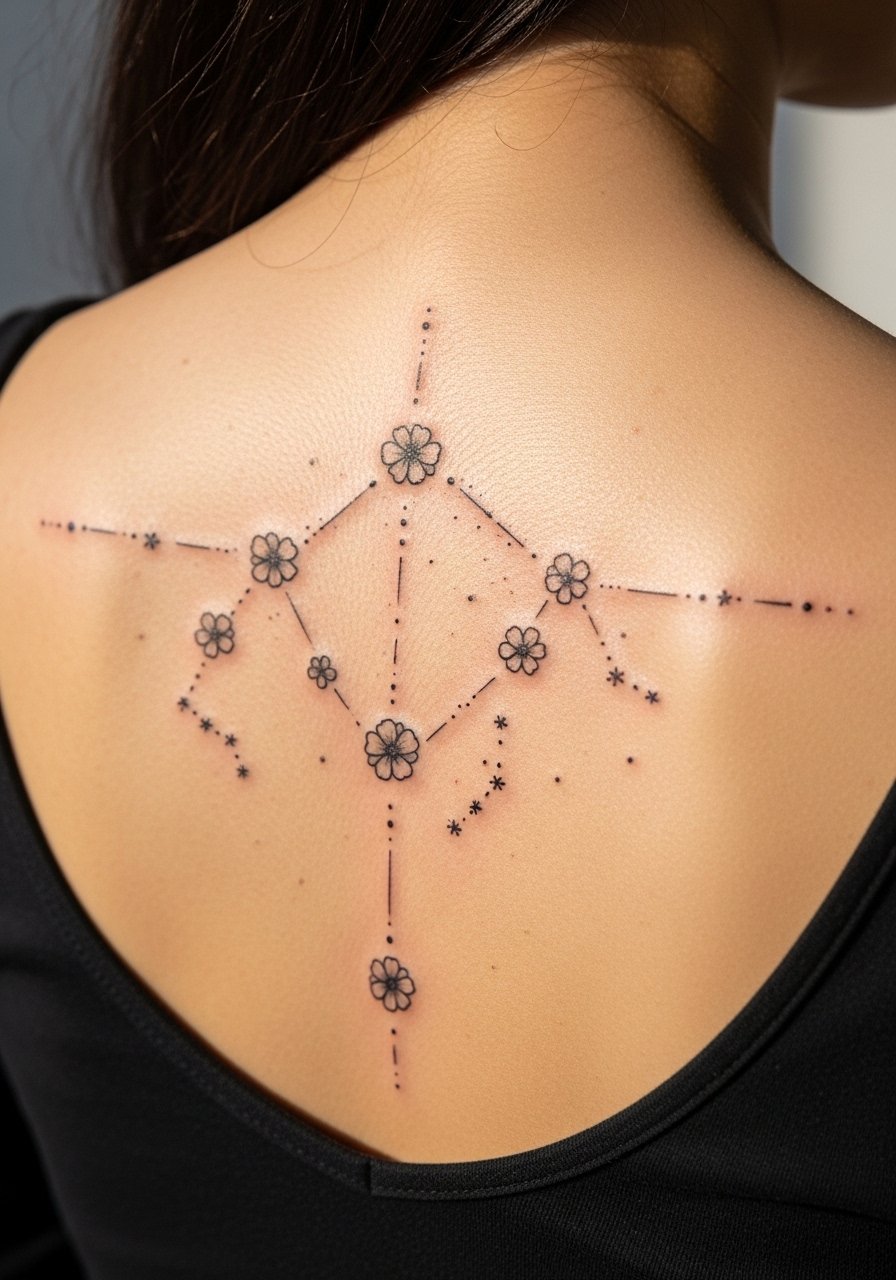 This was an idea I picked up from a collage of artist sketches. It combines a birth flower with star mapping to represent family ties or birth date. The upper back is forgiving for small clusters. Pain is mild. Sessions vary by number of flowers. The key is to space the stars and blooms so they breathe. I see mistakes where artists place too many tiny stars next to thin flower lines. Those elements merge after a year. Ask to test the density on a similar skin patch before committing. For this one, light waterproof protection early on reduces scab loss.