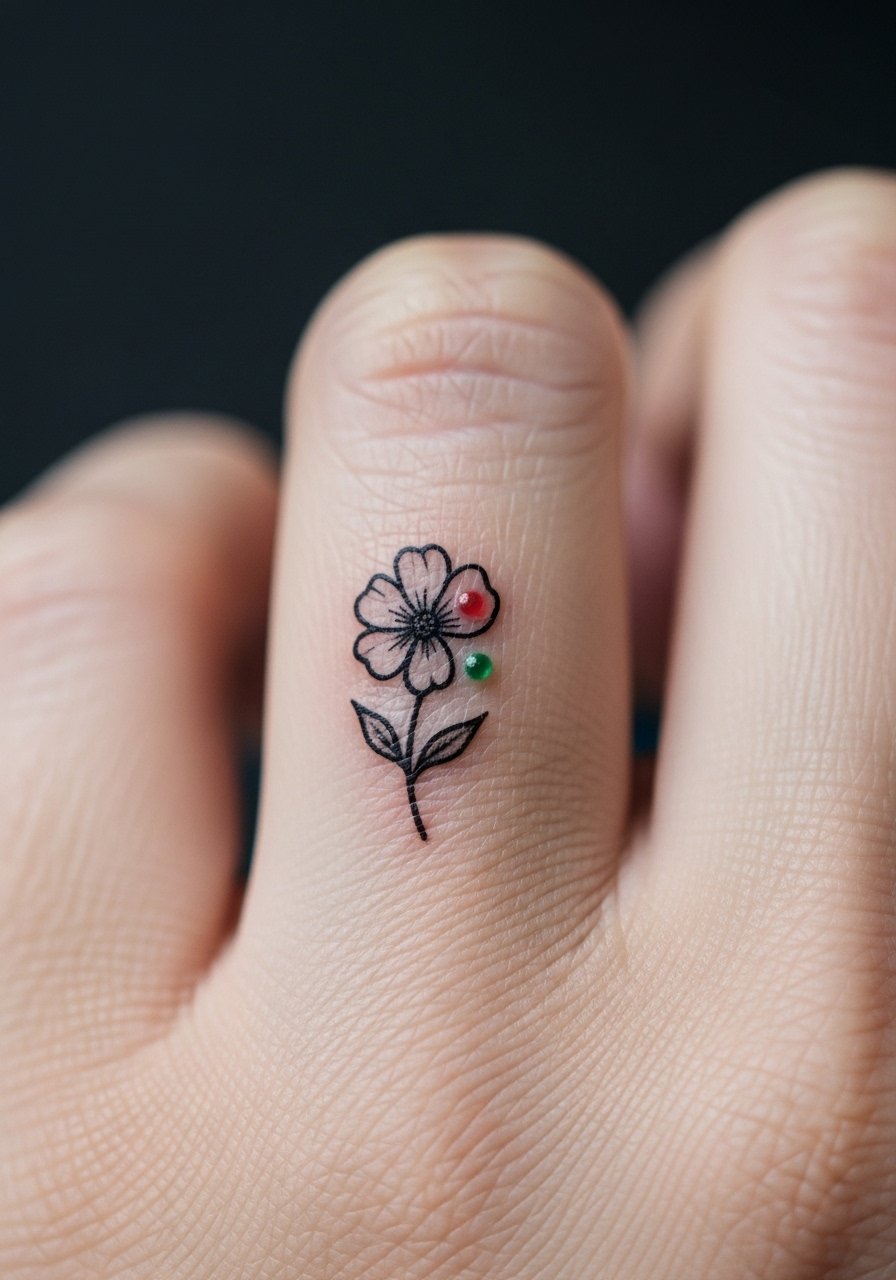 Micro pieces on ring fingers are highly personal. I have seen a tiny bloom paired with a small color dot for a birthstone. Expect quick pain and a likely touch-up due to constant use of hands. Keep the design minimal. Ask for a reliable pigment that holds color on fingers and for slightly bolder black anchors. A mistake is asking for too much color detail. Colored dots can migrate. Consider moving this design a smidge toward the side of the finger to reduce abrasion.