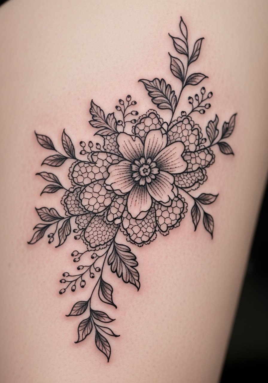 Thighs are forgiving and perfect for larger lace-like compositions that blend multiple birth flowers. Pain is low compared to ribs. Sessions can be long. The difference between a flattering lace bouquet and a messy one is the space between elements. I tell clients to give the artist room to breathe. A common error is asking for too many tiny filigree details which fill in over time. Healed at a year the lace should have gentle softness, not a clumped texture.