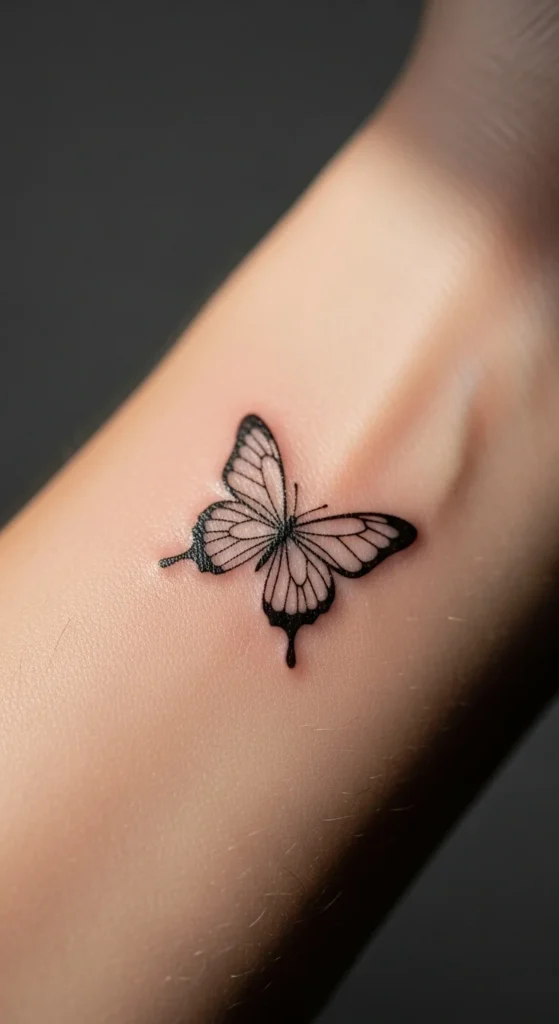 A micro butterfly behind the ear offers a quiet, personal touch. It’s small enough for beginners and quick for artists to complete. If you’re keeping things affordable, limit the wings to a single outline instead of a full shading job. You can test the look by drawing a small butterfly sticker and placing it behind your ear to check size. This spot heals fast because it stays out of the way. It’s great for people who want a tattoo that’s not always visible but still holds meaning. Ask the artist to angle it slightly upward so it looks like it’s lifting off. If you have long hair, clip it up for the appointment so the artist has a clear canvas. This placement works for symbolic growth because it feels like something you carry quietly. It’s simple, clean, and meaningful without being complicated.