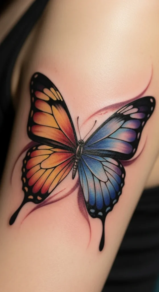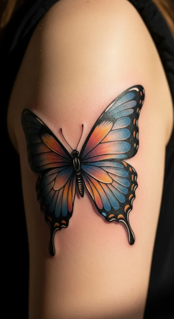 A semi-realistic butterfly gives you detail without the intensity of full realism. The upper arm is a great place because the skin is even and easy to work with. To stay on budget, choose softer shading instead of complex textures. Bring one reference photo to help the artist understand your preferred level of detail. The upper arm holds ink well and doesn’t fade fast. You can also pair the butterfly with a tiny symbol or date close to the wing for a personal touch. This tattoo fits anyone who wants beauty with meaning. It’s simple, clear, and easy to maintain. The upper arm also allows you to grow the tattoo later if you decide to add more butterflies.