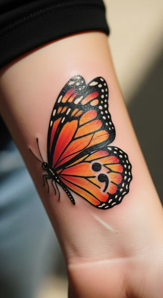 A butterfly with a semicolon detail carries a message of strength and new beginnings. The symbol fits neatly inside a wing or replaces part of a swirl. This keeps the tattoo small and budget-friendly. You can test the design by drawing a little semicolon inside a printed butterfly to see how it blends. Choose a placement like the forearm, ankle, or rib—spots that handle small ink well. This design is meaningful without needing extra text. Many people choose it to mark a chapter of healing or personal progress. Keep the linework simple so the semicolon stays clear. The message stays personal and the look stays soft. It’s a gentle reminder of how far you’ve come.