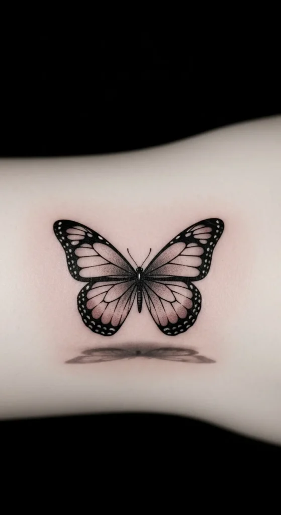 A black-and-grey butterfly offers a classic look with strong contrast. This style fits arms, shoulders, or calves. To keep the budget manageable, choose medium shading instead of dark saturation. Bring a reference image showing your preferred depth. Black-and-grey tattoos age well and stay sharp. This style often reflects resilience and inner strength. You can personalize it by adjusting wing width or adding a small shadow. It’s a simple way to tell a strong story without using color.