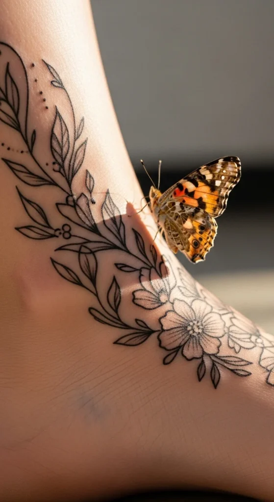 An ankle butterfly is small, simple, and meaningful. The placement is discreet but easy to show when you want to. If you prefer a budget-friendly option, choose a small outline instead of full color. Try placing a sticker near your ankle to check how it fits with footwear. This spot can be slightly sensitive, so tiny designs work best. Keep the wings rounded so the tattoo looks balanced. An ankle butterfly often reflects the idea of walking into a new phase of life. After healing, wear softer socks to avoid rubbing. A clean ankle tattoo remains timeless and personal.