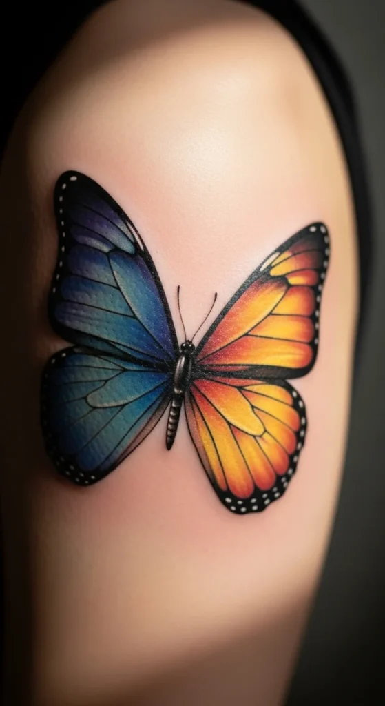 A soft gradient butterfly looks calm and expressive. Instead of bold colors, choose gentle blends like lavender to pink or blue to teal. Limiting the palette keeps the cost low. Try blending color pencils on paper to visualize the gradient. This tattoo works well on areas like the forearm, back, or thigh. The shading should stay light so it ages evenly. This style represents emotional growth and peaceful change. Ask the artist for gentle brush-like strokes instead of heavy coloring. Once healed, keep the area moisturized so the gradient remains smooth. It’s a creative option without being loud.