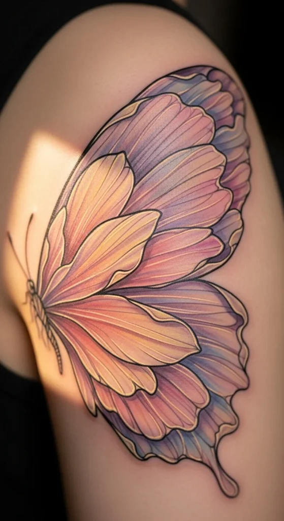 A butterfly with petal-shaped wings blends floral beauty with symbolic meaning. This design works well on the shoulder, forearm, or ankle. To keep the tattoo affordable, choose two petals per wing instead of a full bouquet. Sketch the petal shapes at home to find the right softness. The design represents personal renewal and connection to nature. Choose light shading for a gentle, airy look. The tattoo ages well because petals can be simple without losing meaning. It’s a unique option if you want a softer version of traditional wings.