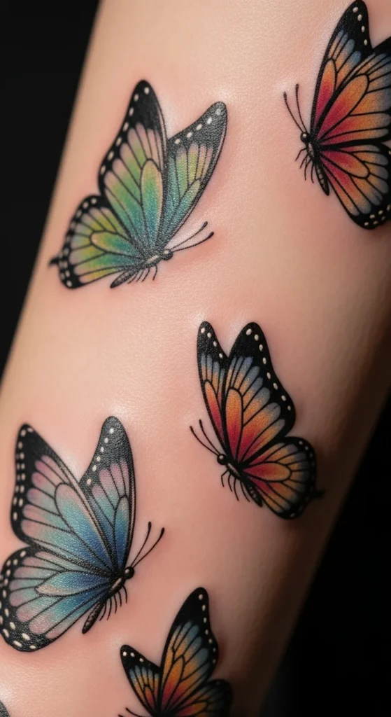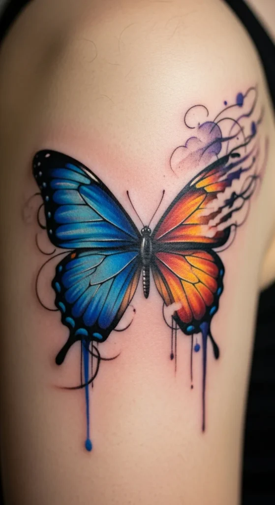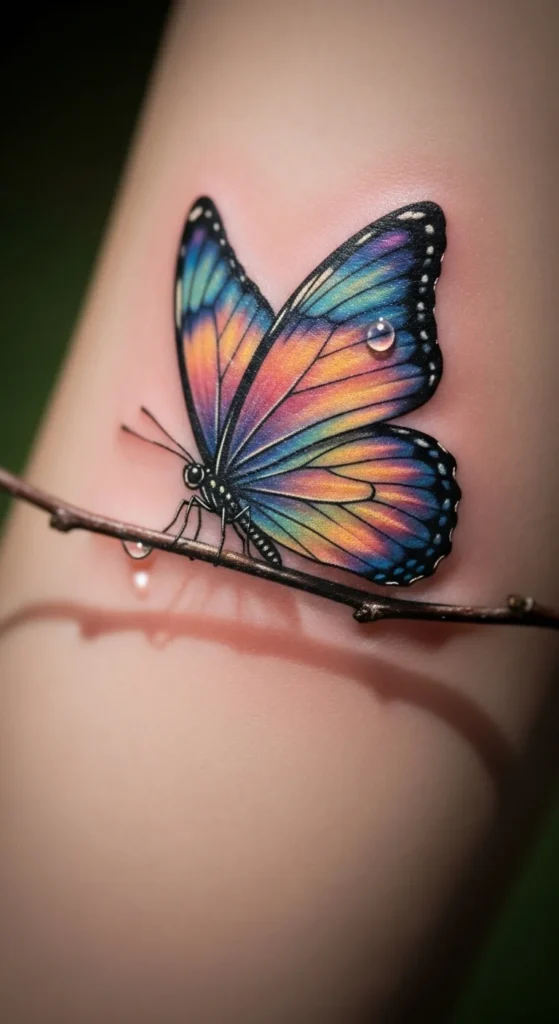 A watercolor forearm butterfly gives you the feel of a painted moment on skin. The forearm offers space for color blends without looking too large. If you’re watching your budget, limit the shades to two or three tones instead of a full rainbow. Even a simple blue-to-purple fade looks beautiful. Bring reference photos showing the level of softness you prefer. At home, practice arranging colors with pencil or watercolor on paper to visualize your palette. This style stands out best when you skip heavy black outlines. It’s a good tattoo to choose if you’re marking a fresh chapter in life. Just remember that watercolor ink can fade quicker, so choose a spot that won’t rub against clothes all day. Use a gentle moisturizer once healed to keep the colors looking lively. A simple placement like this still tells a strong personal story with color and movement.