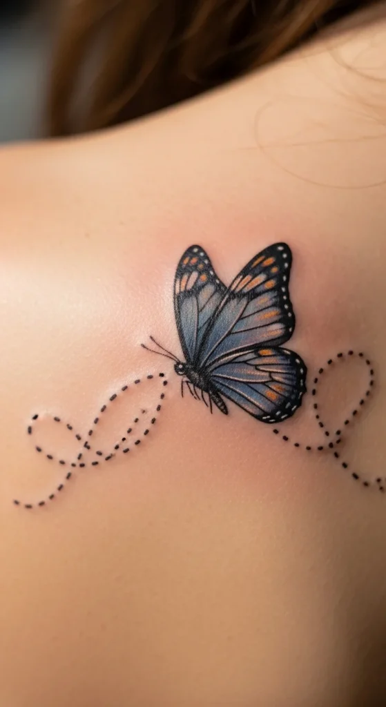 Dotted motion lines give a playful sense of flight without needing additional butterflies. They’re quick for artists to apply and easy on the budget. You can choose curved or zigzag lines depending on your style. Test variations by drawing them next to a butterfly sketch. This design works anywhere—arm, shoulder, or ankle. The dots feel like a timeline of your journey. Keep spacing even for the cleanest effect. This is a low-maintenance and charming style.
