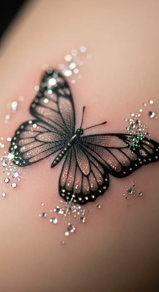 Tiny sparkles add a touch of magic without taking much space. They’re easy to personalize and affordable. You can vary sparkle size for a soft glow effect. Draw sparkles around a printed butterfly to test placement. This tattoo suits ribs, shoulders, or wrists. Sparkles make the butterfly feel alive and hopeful. Choose thin lines so the sparkles stay delicate. Maintain gentle aftercare to keep the small shapes clear.