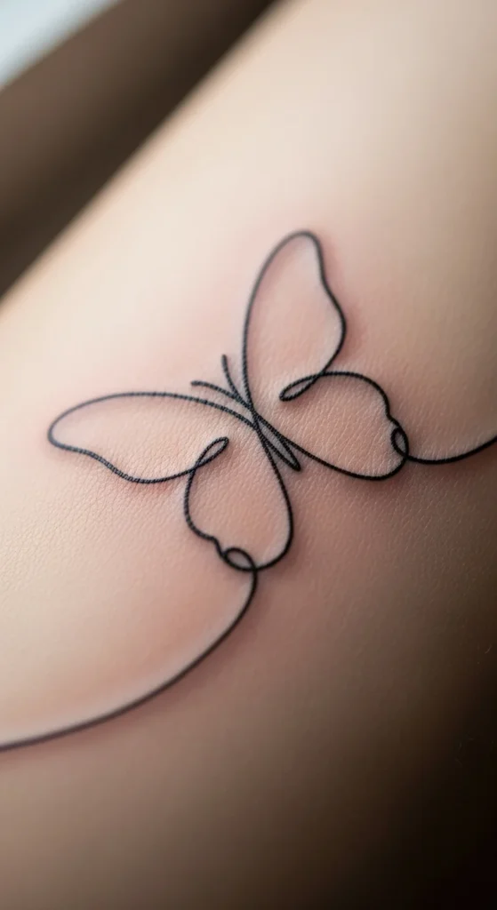 A single-line butterfly works well for people who prefer quiet symbolism. Since it’s drawn with one continuous line, the tattoo takes less time and stays affordable. You can practice the shape with a pen to see how flowing you want the wings to be. This design fits almost any placement—ankle, wrist, rib, or back of arm. It heals quickly because there’s no shading. If you like a softer look, ask the artist to keep the line slightly curved and loose. This style represents personal growth in a simple way. You can even add a small dot at the end of the line to mark a moment in your life. It’s a clean, gentle choice for everyday meaning.