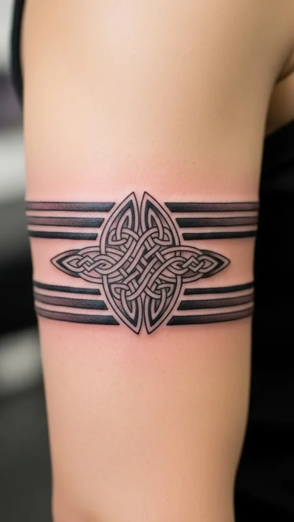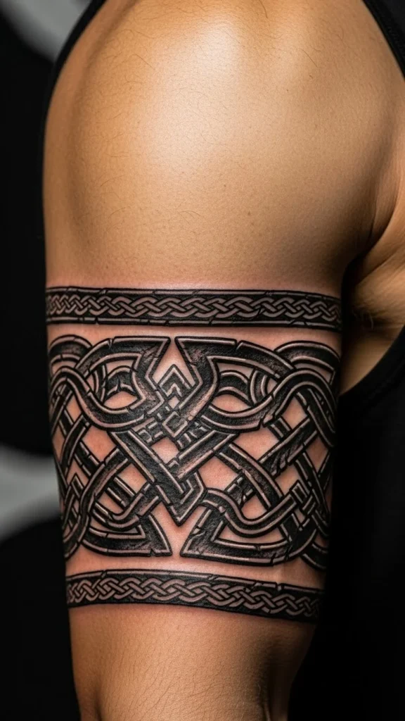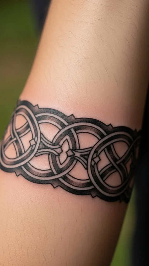 Triple borders give your band a polished finish. The knotwork sits inside the borders, creating a steady frame that wraps smoothly. This style works well on medium to large areas. To keep the tattoo affordable, ask for simple linework without shading. A DIY paper strip with three hand-drawn lines helps you test how wide the borders should be. You can thicken the outer lines for more contrast or keep everything thin for a subtle look. The framed style makes the knotwork feel clean and structured.