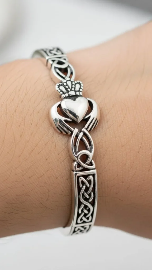 A Claddagh band repeats the classic heart, hands, and crown symbol around the wrist or forearm. This design works well when each symbol is small but clear. If you’re keeping things affordable, choose simple outlines without shading. A DIY idea is to print the Claddagh symbol at different sizes and wrap each version around your wrist. Pick the size that stays readable at a distance. Some people alternate the symbol with small knots to fill space evenly. This keeps the band from looking too repetitive. You can personalize the heart shape by choosing something more rounded or more pointed. If you want a cleaner finish, add thin top and bottom borders.