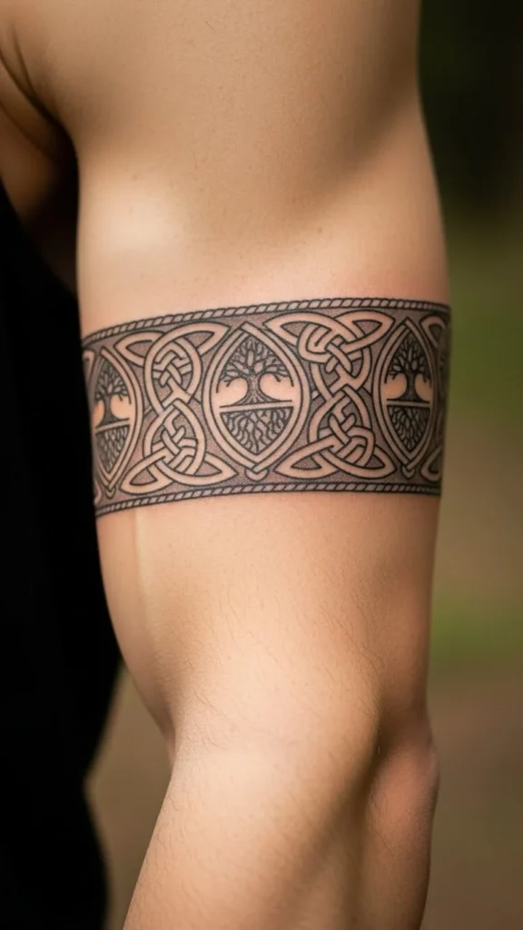 A small tree pattern woven into Celtic loops makes this design feel earthy and calm. It works well for forearms and calves where the wrap feels long. You can keep this tattoo affordable by sticking with basic linework. A simple DIY idea is to draw tiny tree silhouettes and place them between knot loops on paper. Adjust spacing until it looks even. If you want something gentle, shrink the tree shapes so they sit quietly inside the band. For more presence, enlarge them slightly. A tree band pairs well with nature-themed tattoos, but you don’t have to match it with anything for it to look balanced.