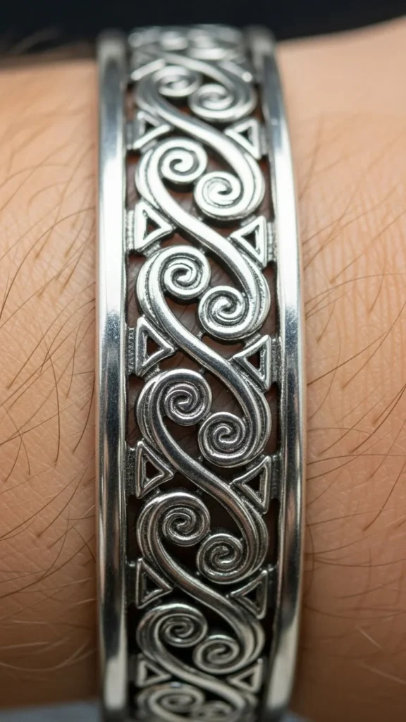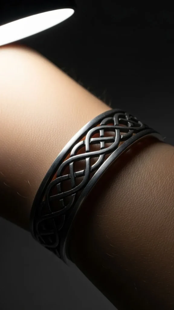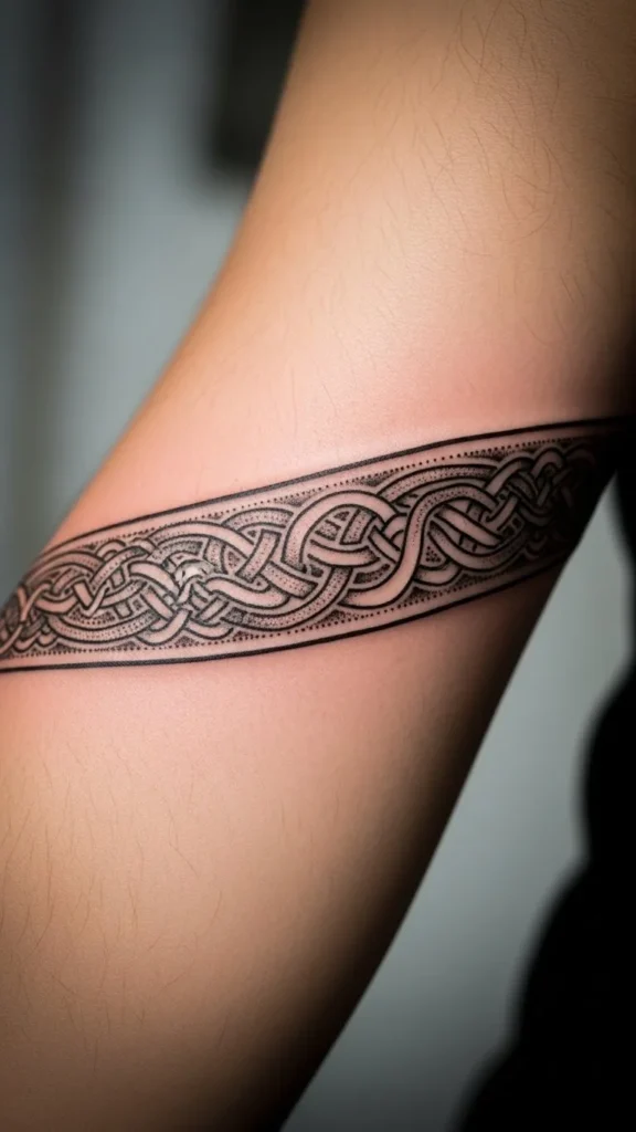 A Celtic leafwork band blends nature-inspired shapes with flowing loops. This design feels gentle but still structured, making it a good option if you want something organic. The leaf shapes fill open areas so the band doesn’t look empty. Keep the leaf size small to help with wrapping around curves. A simple black outline works well if you’re keeping costs down. You can color in small accents later if you decide to upgrade. Try drawing a short section on paper and repeating it around your arm to check how it flows. This helps avoid awkward breaks where the pattern meets. If you like symmetry, ask your artist to mirror the leaf shapes on opposite sides. This keeps the band looking balanced from any angle. It’s a visually calm style that still stands out without feeling loud.