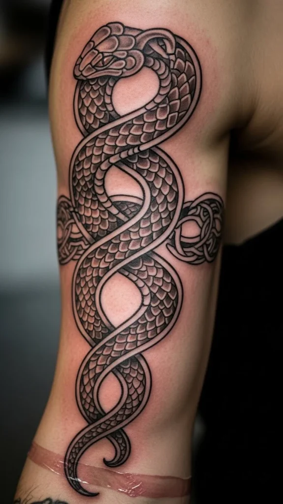 A serpent-style Celtic band winds around the arm using flowing shapes that mimic a serpent’s movement. It works well for people who want a design with motion. You can keep it cost-friendly by choosing plain outlines. A DIY idea is to cut a long curved strip of paper and wrap it around your arm to test how the curves might sit. This helps you adjust the tilt of each section. If you want something bold, ask for thicker lines around the serpent shapes. If you want something softer, keep the linework thin. This design looks good in both narrow and wide bands.