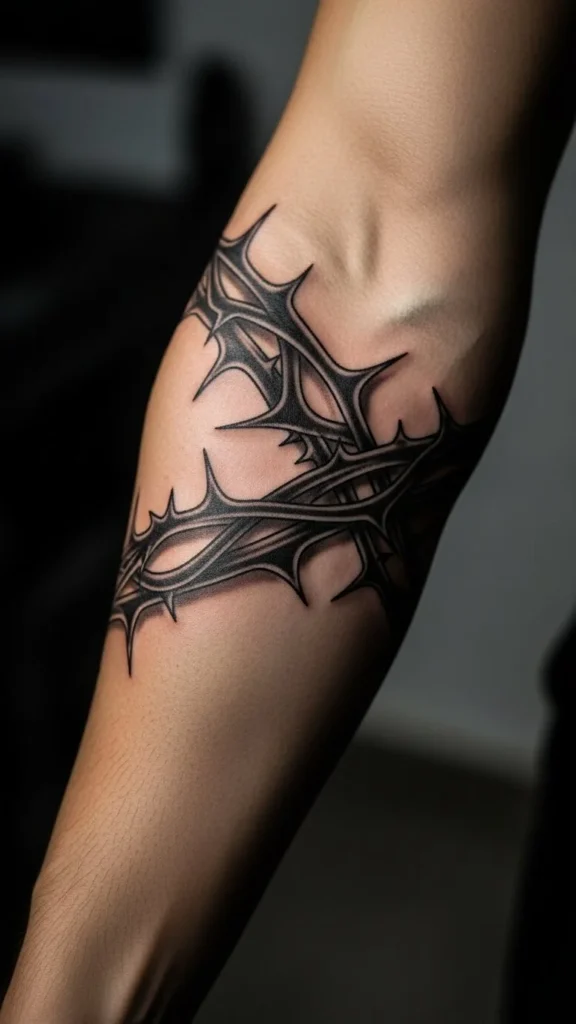 A thorn-style Celtic band blends knotwork with sharpened points. It gives the tattoo a strong edge without looking harsh. This design fits well for people who want something protective or bold. The pointed shapes create rhythm around the arm, making the wrap look smooth. You can keep the tattoo cost-friendly by avoiding heavy shading and sticking with clean outlines. A DIY sketch with triangles and curves helps you practice the spacing before showing your artist. If you prefer a softer feel, ask for rounded point tips instead of sharp edges. This keeps the style balanced. Thorn bands look best when the width stays even, so measure your arm to make sure the pattern closes cleanly without distortion.