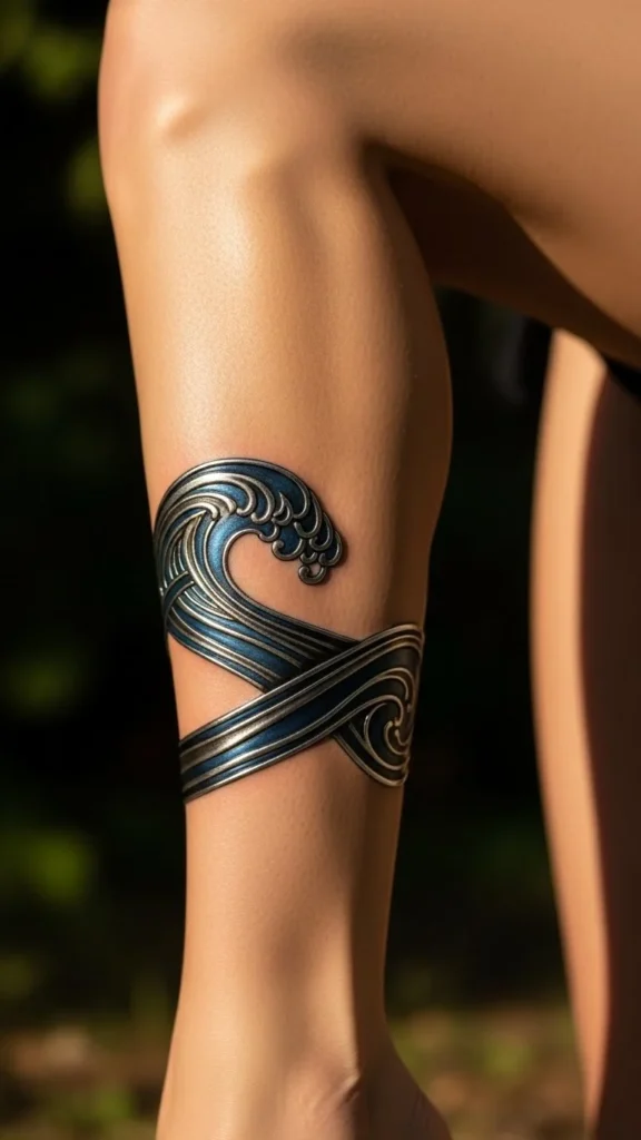 A Celtic wave band brings movement into the design. The pattern uses flowing lines that mimic water while still holding a Celtic feel. This makes the tattoo calming and easy to pair with other pieces. It works nicely on calves or forearms where the wrap feels long and smooth. You can make the design budget-friendly by choosing simple linework without gradient shading. For a quick DIY idea, print a wave strip and tape it around your leg to see how it flows. Adjust the spacing until the wrap feels natural. If you want more detail, add small dots inside the curves. This creates texture without adding cost. Wave bands look good on both narrow and wide placements, depending on how bold you want the piece.