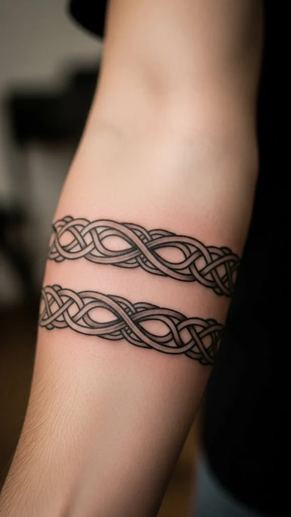 A heart knot band repeats small heart-shaped patterns made from Celtic loops. This style is good for people wanting something meaningful but not too bold. It wraps well around narrow placements like wrists and ankles. You can keep it budget-friendly by choosing thin lines without shading. A DIY test strip helps you choose whether the hearts should sit close together or with small gaps. If your wrist is slim, ask your artist to shorten the loops so the pattern doesn’t stretch out. A thin border on the top and bottom makes the band feel balanced. For a softer touch, add tiny dot accents between each heart.
