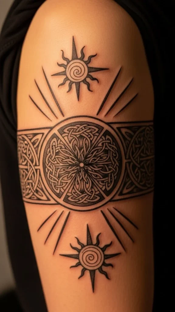 A Celtic sun band uses circular rays and curved knotwork to create a warm-looking pattern. The design works well on thicker parts of the arm because the circles stay round. If you want something cost-friendly, ask for minimal shading and clean outlines. For a simple DIY idea, use a compass or round object to trace small circles onto paper. Repeat them in a strip to check how they wrap. Some people add tiny dots around the rays to make the pattern feel more detailed without increasing tattoo time. A sun band can be worn alone or paired with other Celtic designs. If you want something softer, ask your artist to round the rays into teardrop shapes.