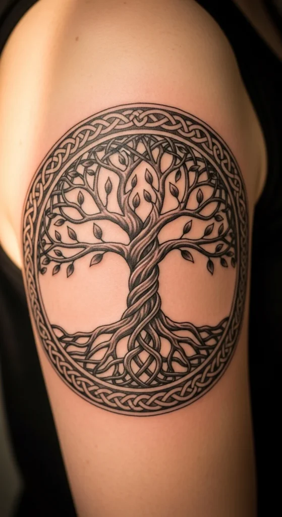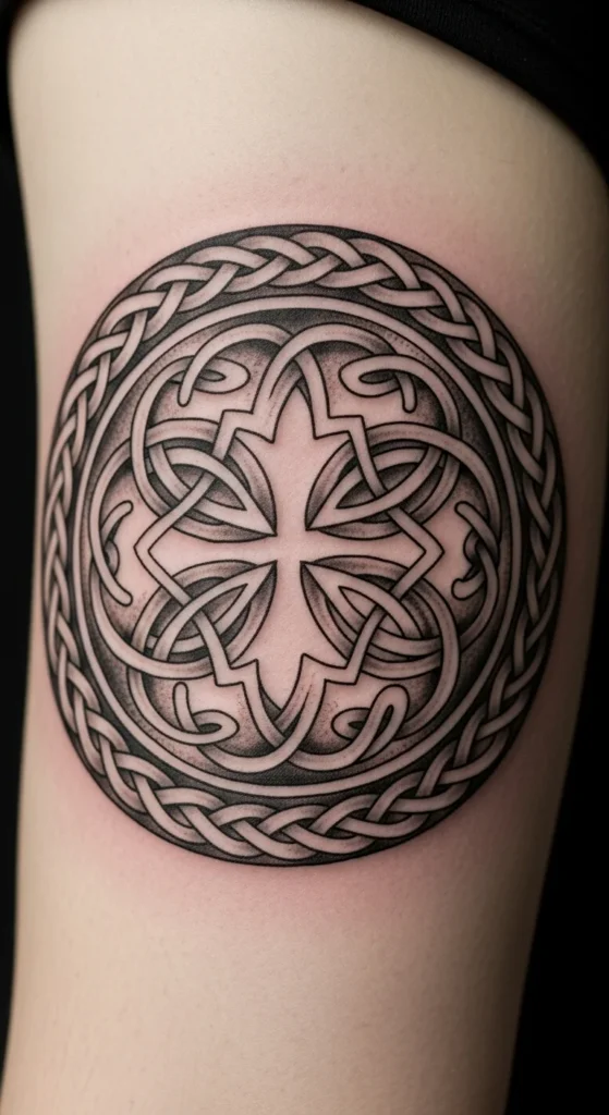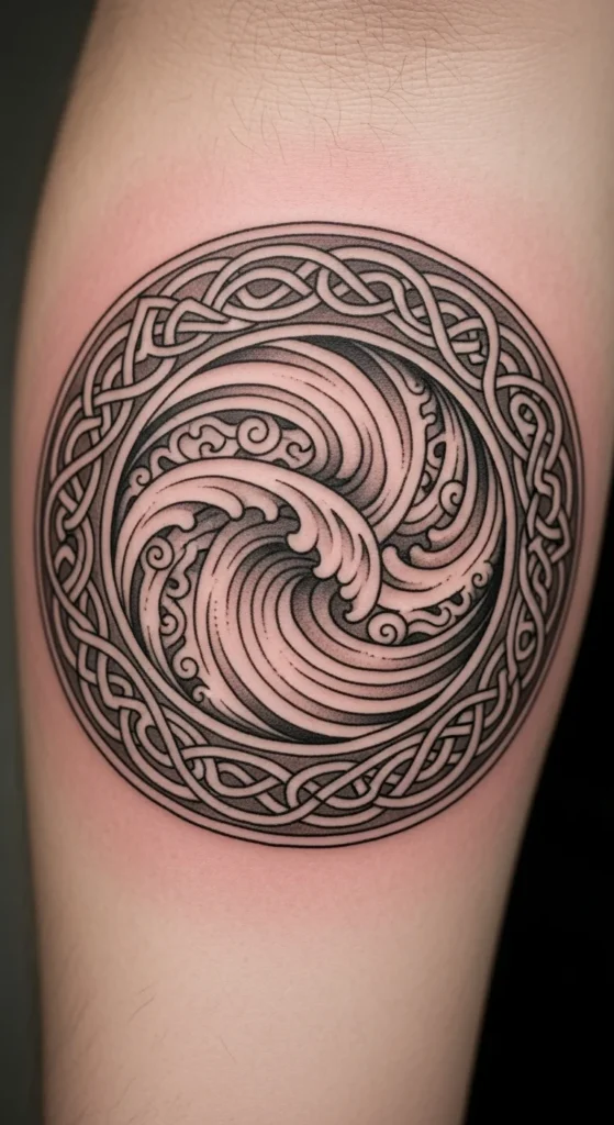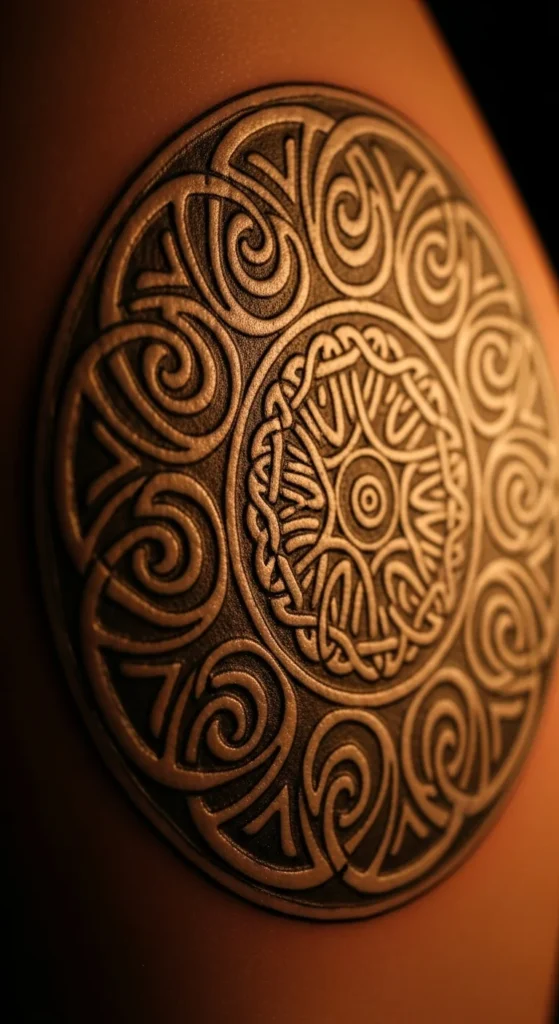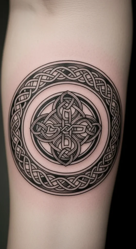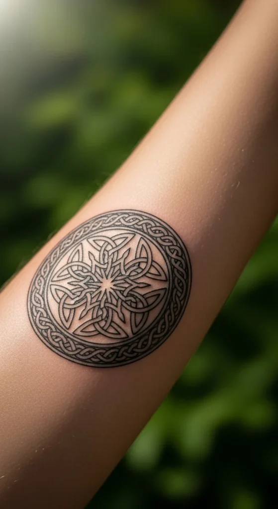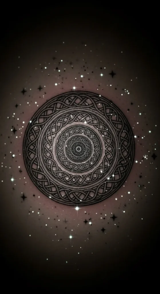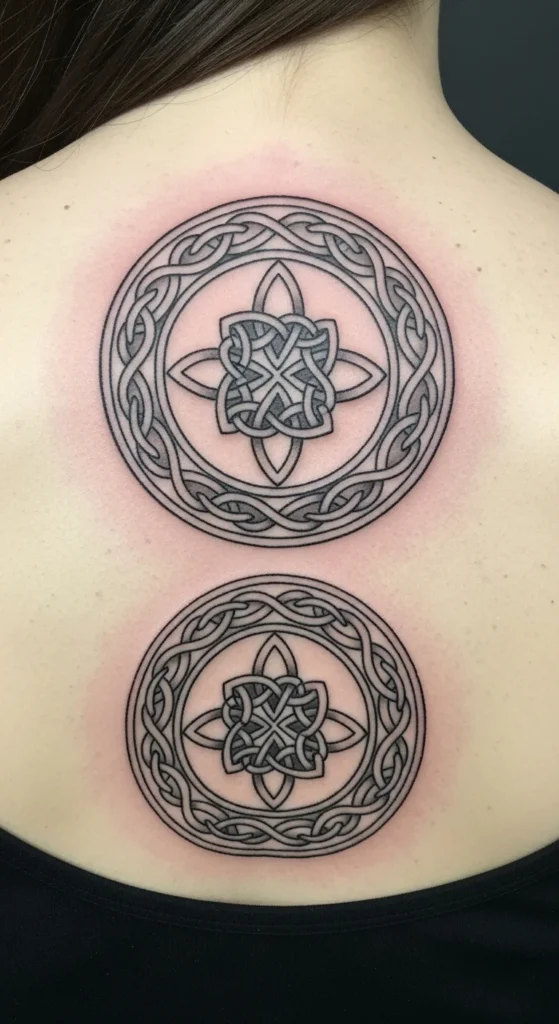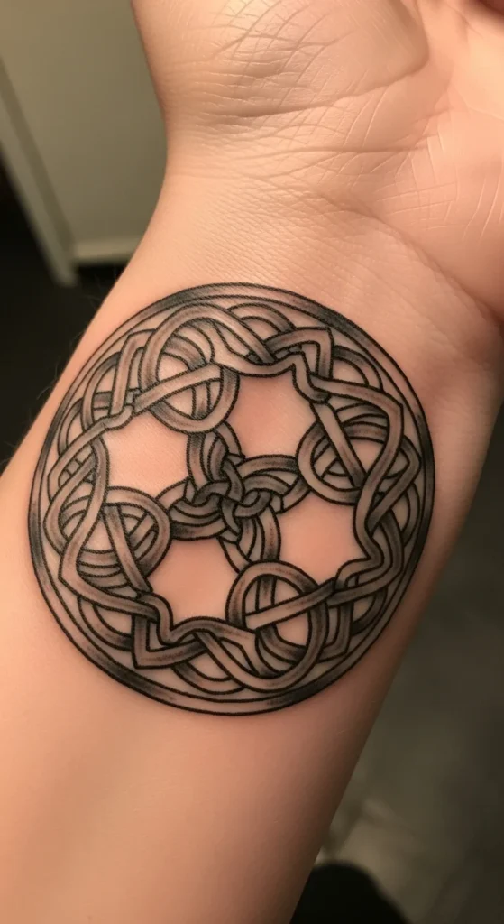 This style stands out immediately. Strong shading and thick lines create a grounded look. It works well for larger placements like the back or shoulder. Keep the circle large enough so the knot shapes stay readable. If budget is a concern, ask your artist to remove filled sections and keep the design mostly line-based. You can fill in darker areas later. Testing the size with paper cutouts at home helps you visualize how bold the piece will feel on your body.
