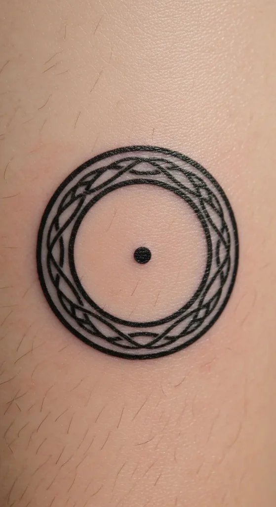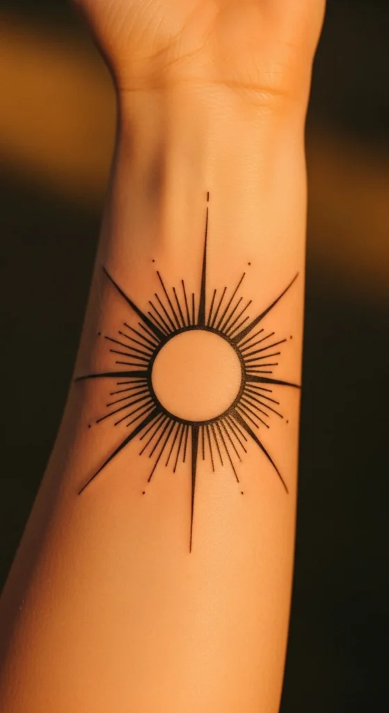 A center dot creates a quiet focal point without adding clutter. This design suits people who enjoy symbolic minimalism. You can place it almost anywhere, but the wrist and inner forearm work especially well. If you’re on a budget, this is a quick tattoo to complete. You can size the dot using a pen at home to see what feels balanced. The simplicity also makes it easy to add surrounding shapes later, like rays or tiny lines.