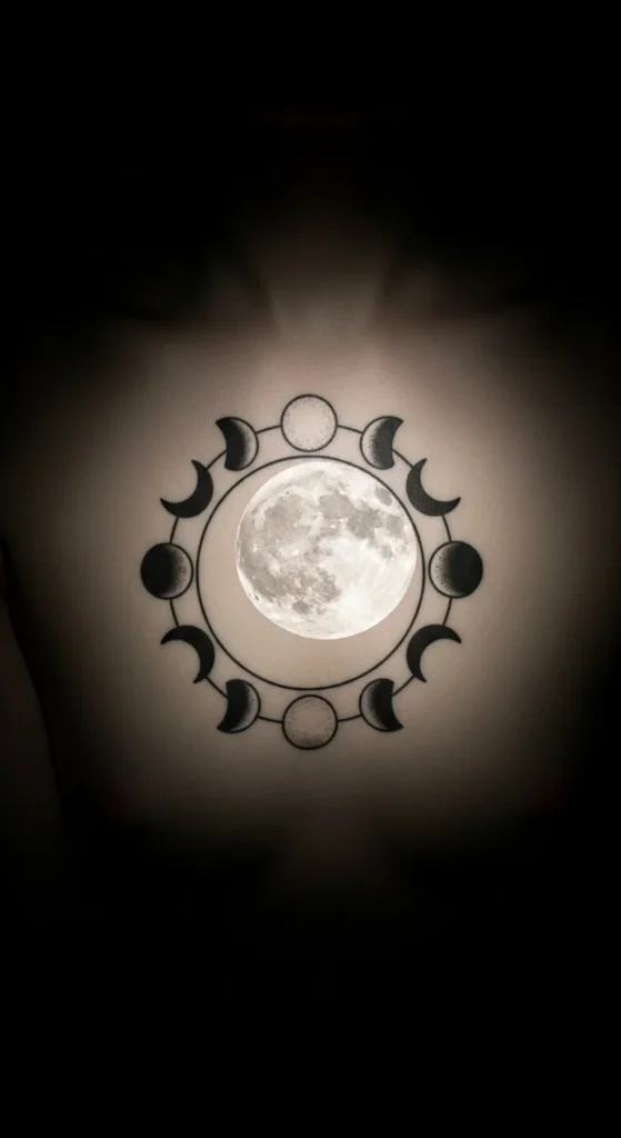This idea brings a calm mood. The circle represents continuity, while the moon phases show cycles and change. You can place it on your forearm, thigh, or back. Try keeping the phases minimal so the circle stays the main focus. If you want something budget-friendly, use dot shading instead of full gradients. Print moon shapes at home to explore spacing. If you want a later upgrade, your artist can add stars or small accents without reworking the original circle.