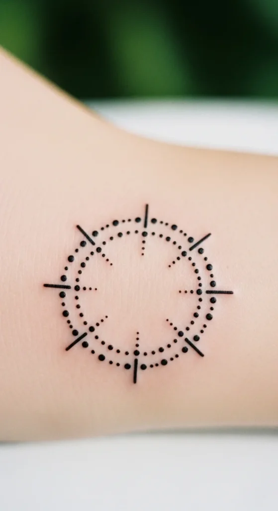 Dotwork gives the tattoo a gentle rhythm without adding weight. You can use dots to mark corners, fill gaps, or outline curves. Straight lines help stretch the circle visually. This design works well for small or medium placements. If you’re watching your budget, dotwork often takes less time than heavy shading. Try using a ruler to draft straight lines around a traced circle to play with spacing. Dots can also help create symmetry even if the circle is kept simple.
