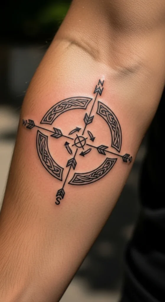 Arrow points add a clear sense of direction. They can represent guidance, focus, or personal movement. You can place the arrows at four fixed spots to keep the shape clean. This works well on the forearm where alignment is easy. To keep the budget friendly, choose simple arrow shapes instead of detailed ends. Try printing out circles and marking different arrow placements until one feels right. Arrows also give room for future add-ons like small dot trails.