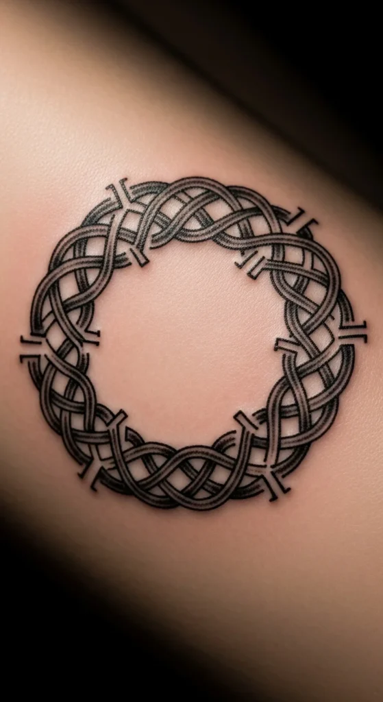 A braided border adds strength without overwhelming the central design. You can place it around a simple circle, symbol, or blank space. This versatility makes it easy to match with future tattoos. If you’re keeping an eye on cost, choose fewer braid turns or repeat the same pattern for quicker linework. Use thick markers at home to test how bold you want the border to feel. This helps you visualize balance before booking your session.