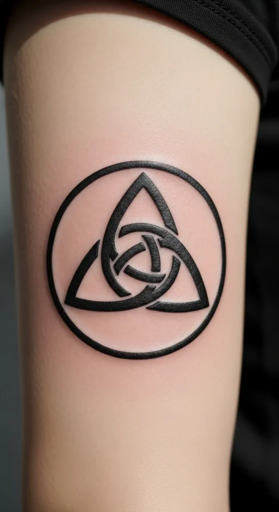 A trinity knot inside a circle creates a balanced look with symbolic layers. Some choose it to show unity or personal connection. The design stays neat even at smaller sizes, making it a solid option for people trying their first tattoo. You can place it on compact areas like the inner forearm or shoulder cap. To save on cost, go for solid lines instead of heavy shading. Trace the outline onto paper at different sizes to see what fits your proportions best. If you want more depth later, you can return to add accents without needing a full redesign.