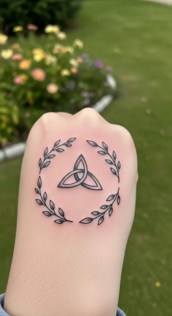 Adding leaves brings a grounded feel to the circle. This design pairs well with anyone who enjoys nature themes or wants softer shapes. You can keep the leaves small so they feel like quiet extensions of the knotwork. Try placing this on the shoulder blade for a gentle curve. If you prefer a more affordable approach, choose fewer leaves. You can revisit the tattoo later and expand the foliage gradually. Sketching simple leaf shapes beforehand makes the design easier to plan without adding complexity.