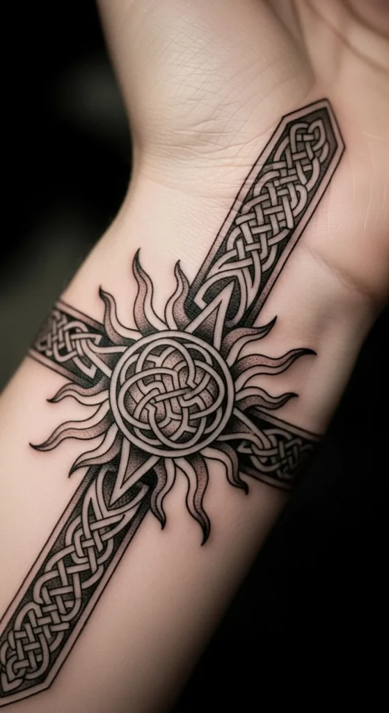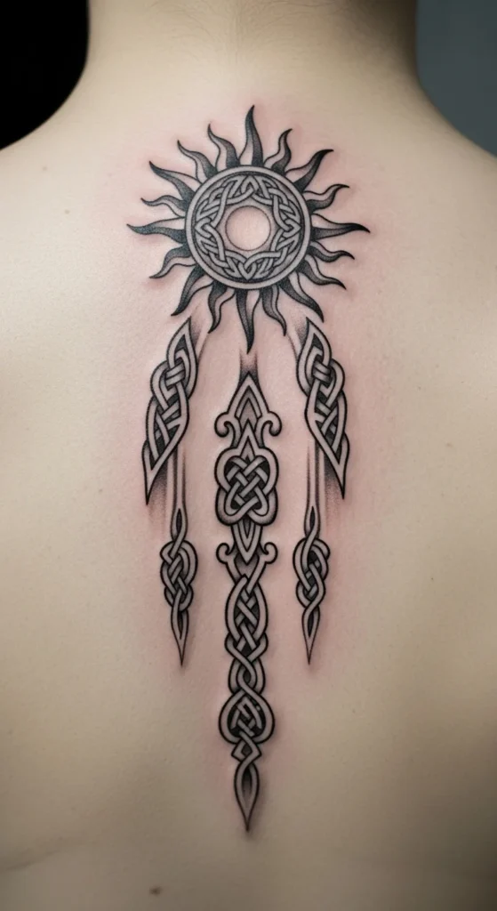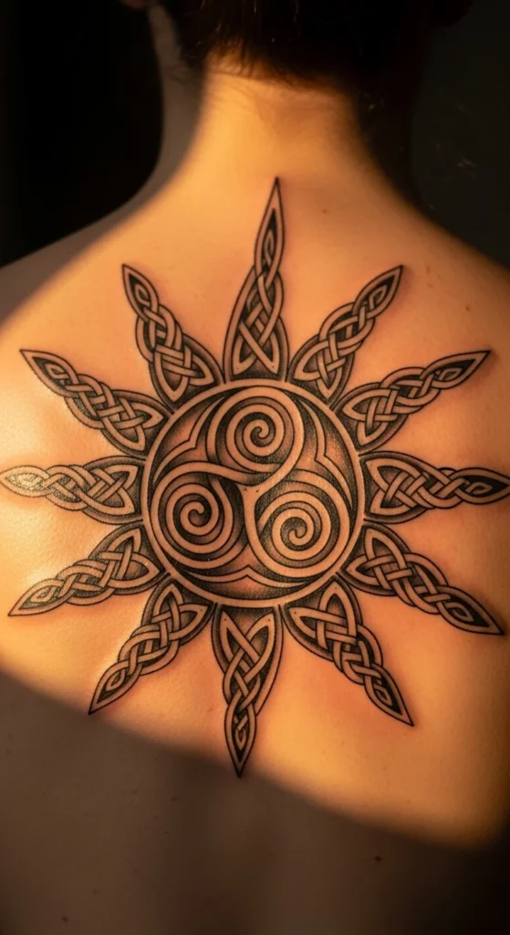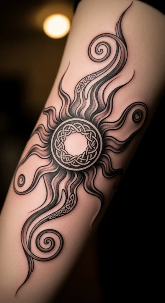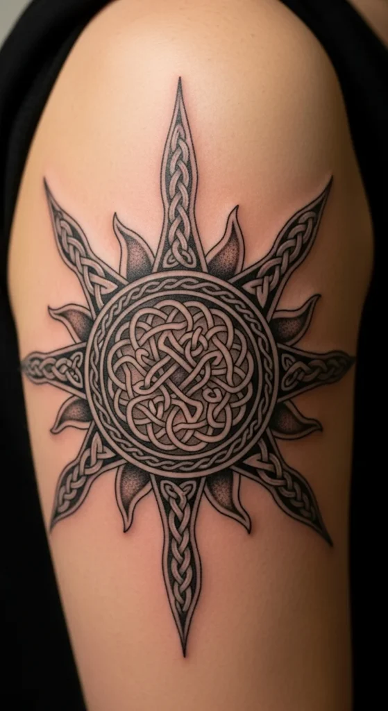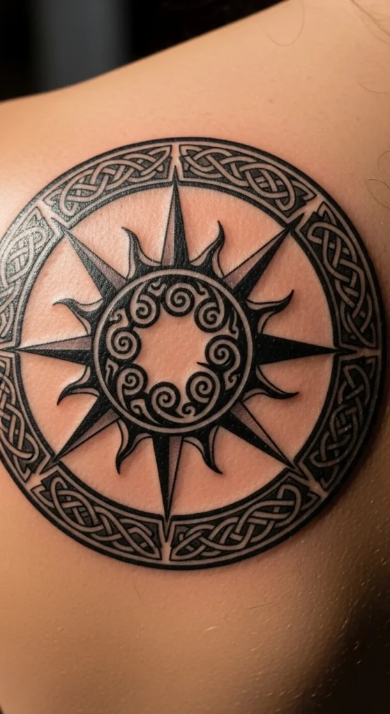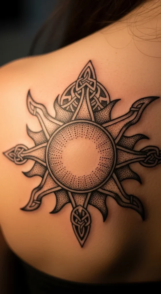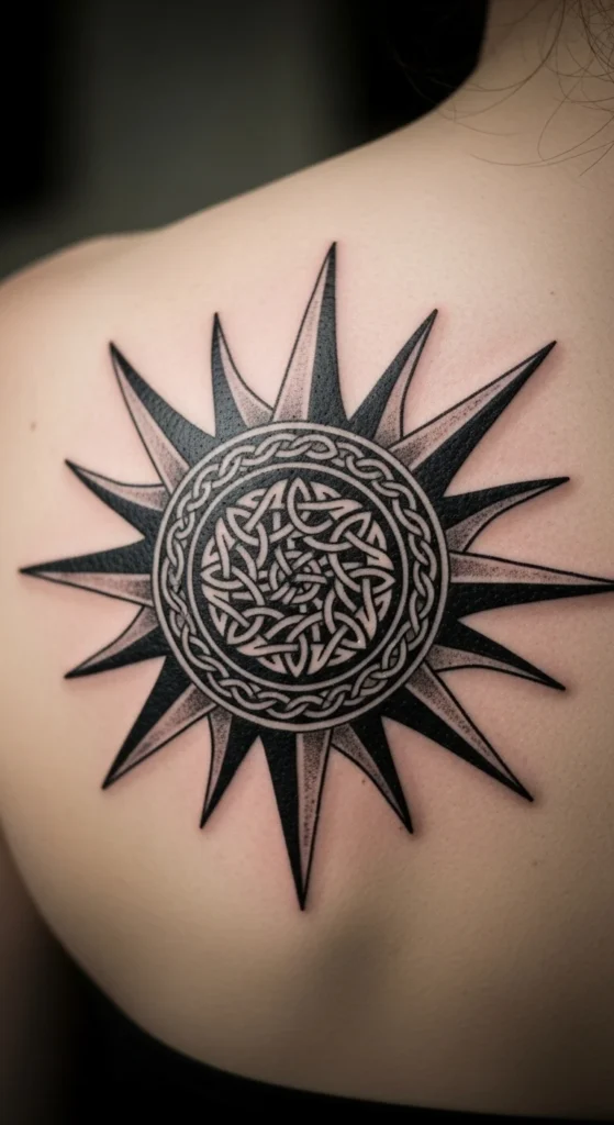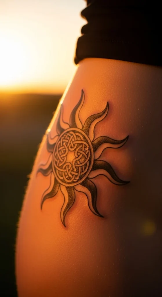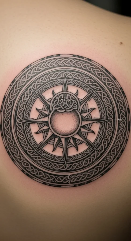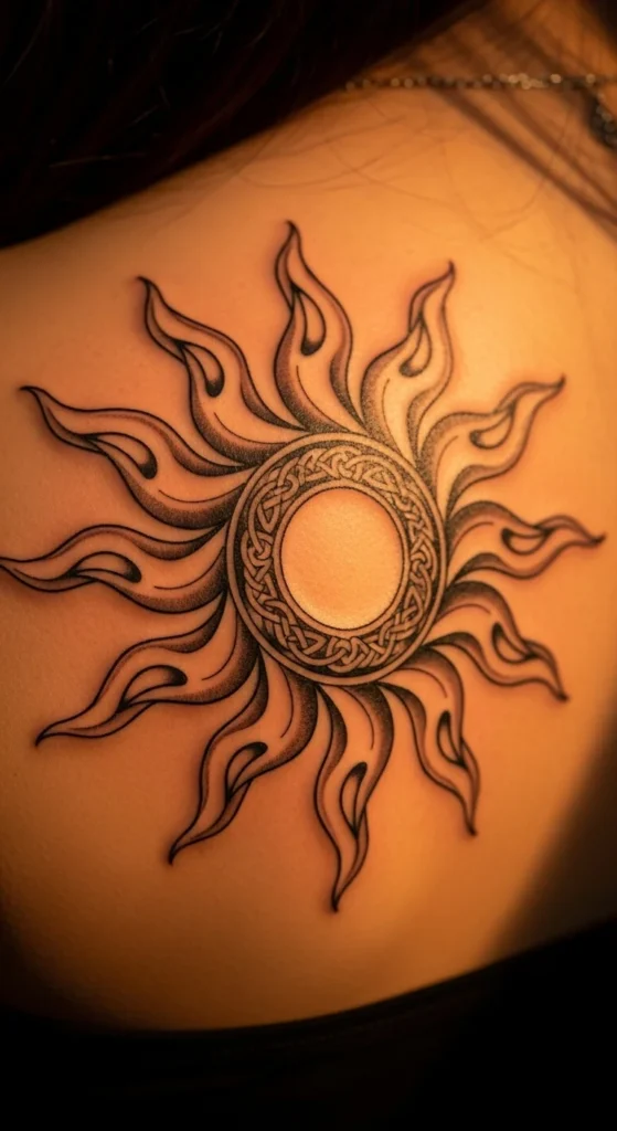 This idea combines the structured loops of Celtic art with the layered symmetry of a mandala. It’s ideal if you like designs that feel orderly without being overly complicated. Start with a small inner circle, then add repeating rings—some can use knot patterns while others hold simple shapes. When sketching, try breaking the circle into even sections using a light pencil grid; this helps you create balanced patterns. The sun rays can emerge from the outer ring, giving the piece a glowing look. This style works beautifully on the upper back, thigh, or stomach because larger areas give the rings room to breathe. If you want an affordable session, reduce shading and stick to bold outlines.
