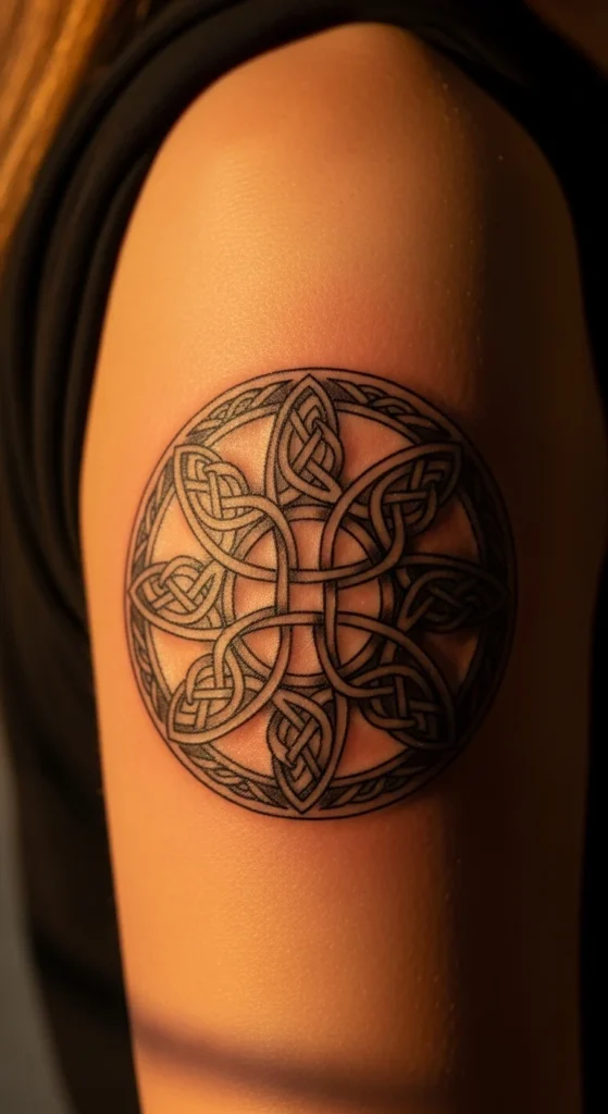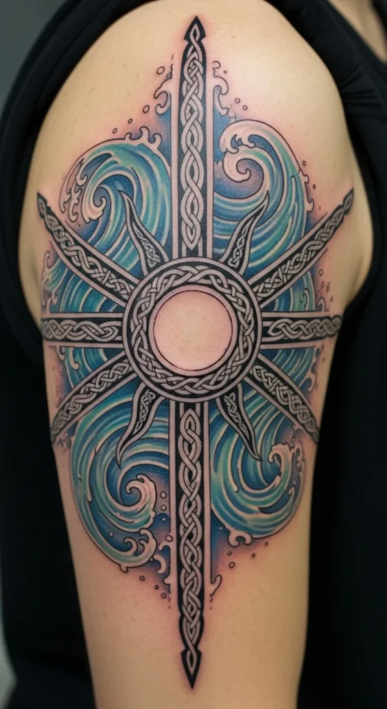 This idea centers on a full circle of knotwork forming a bright sun shape. It works well if you like designs that look structured yet flowing. You can keep it small for the wrist or scale it up for the shoulder. Short lines with curves help it feel balanced without feeling too heavy. If you’re sketching it yourself, begin with a circle and draw loops that repeat around it. This helps you keep the pattern controlled and clean. Consider using thicker lines for the outer ring so the rays stand out clearly. If you enjoy DIY planning, practice the knot paths on paper first, then trace over them to see how the loops connect. This helps you build confidence before taking it to an artist. If you want color, light orange or muted amber shading can add warmth without overwhelming the linework.