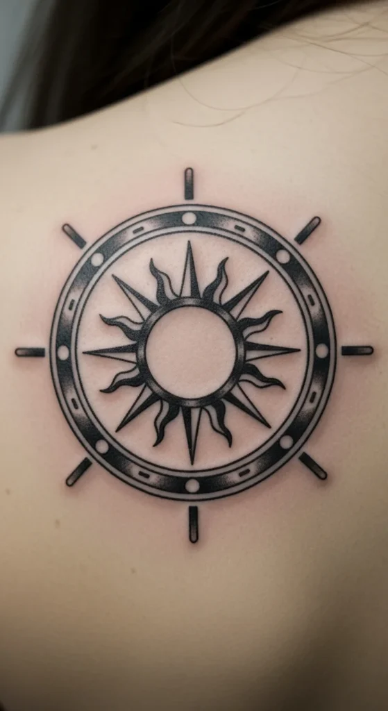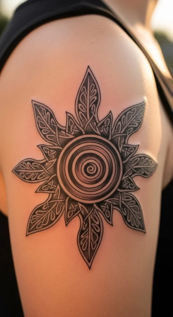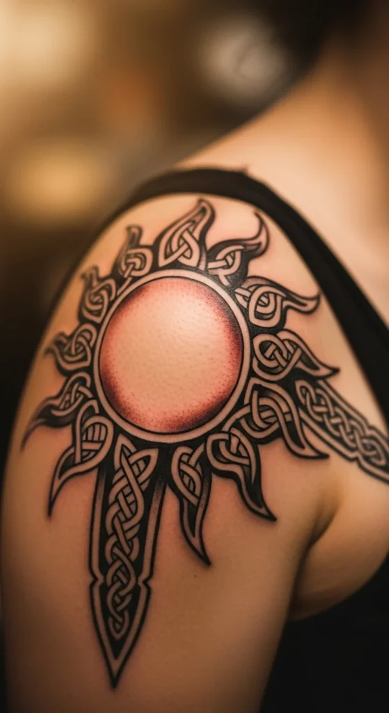 This version wraps around the shoulder, making it feel like part of the body’s structure. The sun center sits on top of the shoulder, while rays extend downward or outward. If you want a design that feels large without covering too much space, this is a smart pick. When sketching, draw a gentle curve rather than a perfect circle to match shoulder anatomy. Add open knot patterns to keep it from feeling too dense. Because shoulder skin moves a lot, bold lines help maintain clarity over the years. This style also pairs beautifully with future upper arm tattoos.