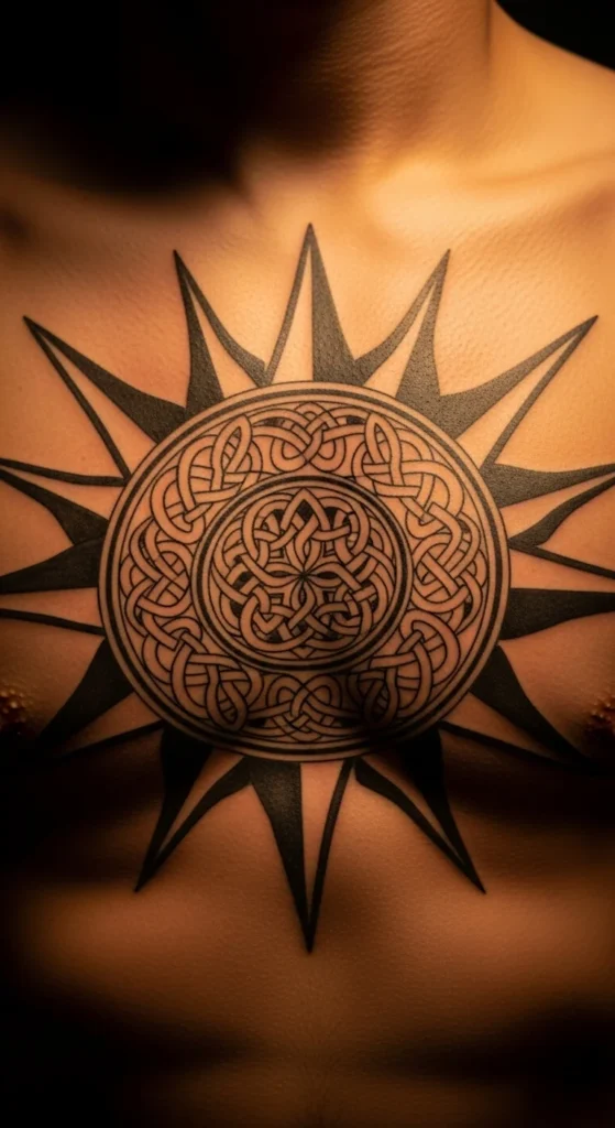 A chest piece gives you room to go large while keeping the design balanced. The sun sits in the center, and rays extend outward toward the shoulders. This works well if you want a powerful statement tattoo. When sketching, draw the main circle first, then plan the rays with soft guidelines so both sides match. Add knotwork selectively so the tattoo doesn’t feel too heavy. Light shading under the rays helps them appear lifted. If cost matters, keep the knot details simple and focus on strong outlines.
