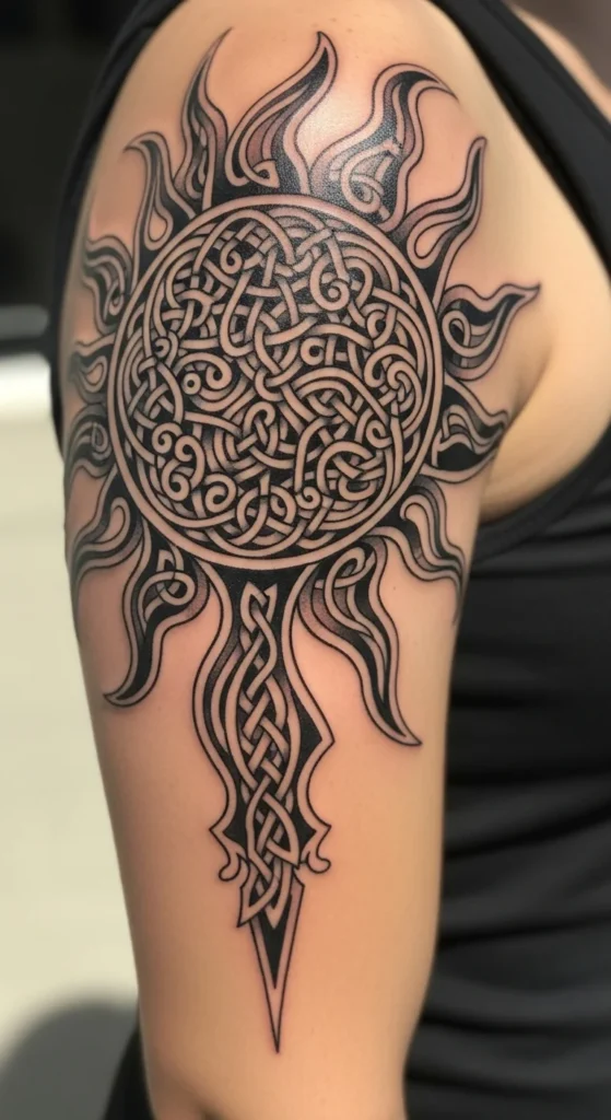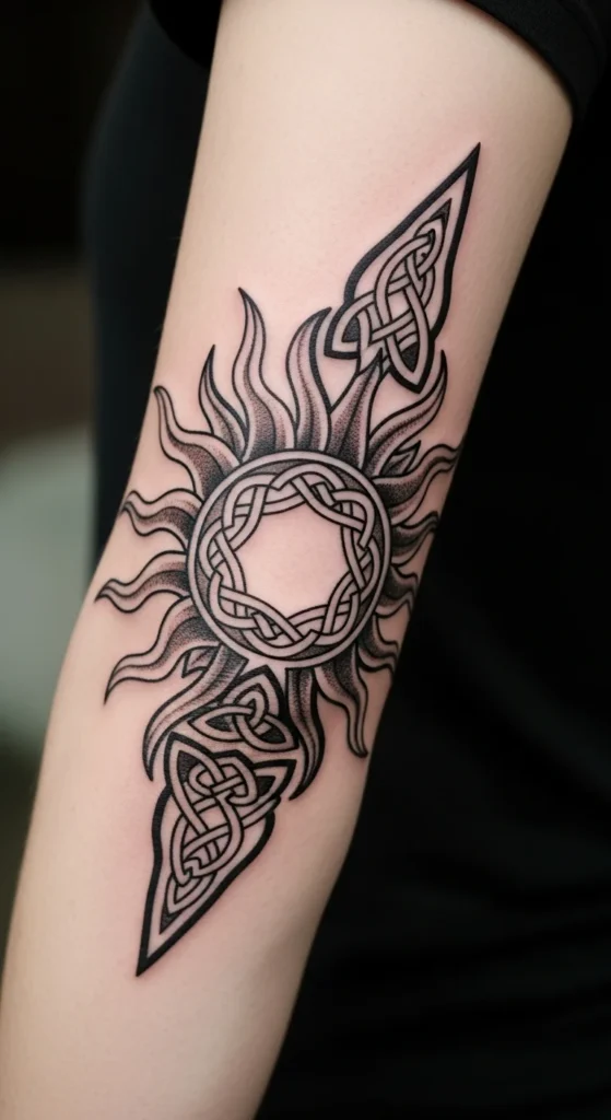 Triangles can bring a strong, sharp look to a Celtic sun design. They frame the circular center, giving the tattoo a striking contrast between curves and angles. Begin with two or three triangles stacked behind the sun, then build rays that pass between them. If you’re sketching by hand, use a ruler for the triangle edges so the geometry stays clean. This tattoo works well on the forearm or upper arm because the shape flows naturally. Keep the linework bold for longer durability, especially if you plan to place it where sunlight hits often. You can leave the triangles empty or fill them with small knots to get more texture without making the design overly heavy.