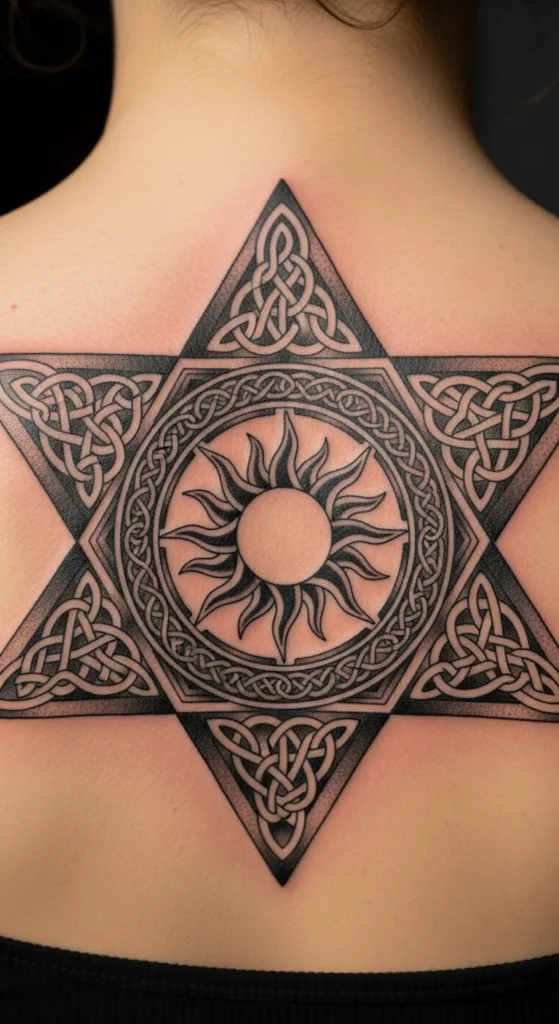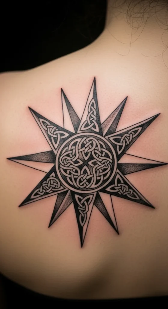 This design mixes star points with softer knot rays to create contrast. It’s perfect if you enjoy sharp geometry combined with Celtic influence. Sketch the star first for structure, then fill the gaps with knot-style rays. The blend keeps the design interesting but not overly complex. This idea fits well on the forearm, back, or thigh. If you want a simpler version, remove the knot rays and rely on the star points alone.