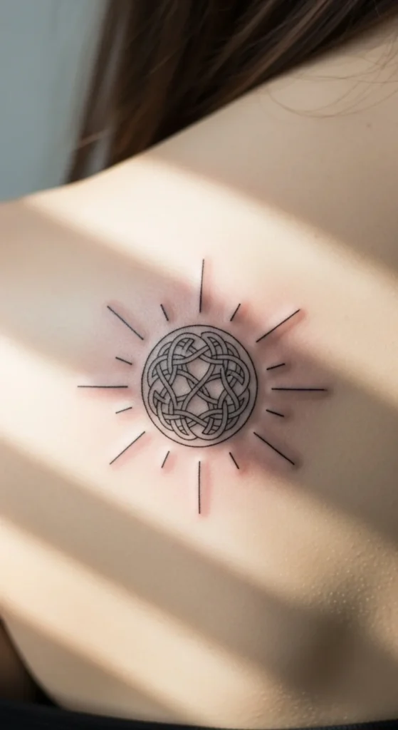 This option is perfect if you want something subtle while keeping the Celtic influence. Instead of deep knot paths, the design uses thin, controlled strokes that form a light outline of a sun. You can place it behind the ear, on the ankle, or on the rib area for a more discreet look. Start with a soft circular guide, then add very small loops that hint at Celtic knots rather than fully building them. This keeps the sketch approachable and easy to customize. If you prefer DIY touch-ups, test the pattern with a gel pen on your skin to see how the rays sit. Minimal designs heal quickly because there’s less ink density, and they stay crisp with simple care. This style works well if you’re planning your first tattoo or prefer gentle artwork.
