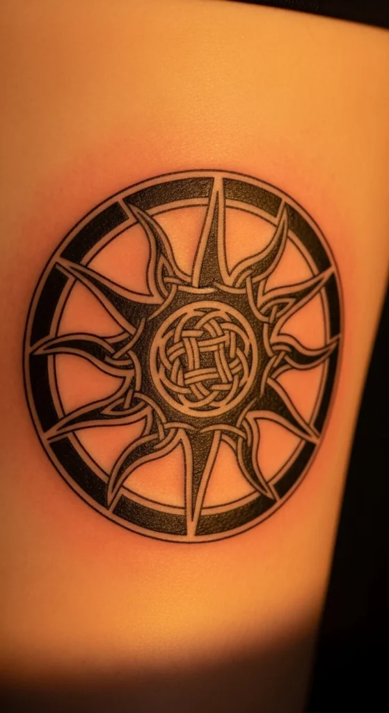 This design uses a wide outer ring that anchors the entire tattoo visually. It’s great if you want something bold without needing a lot of small details. Inside the ring, add short rays made from repetitive knot loops or simple shapes. This keeps the design friendly for beginners while still giving a strong, powerful look. If you’re planning placement, consider the upper arm or back of the shoulder, where round shapes sit comfortably. The thick ring also protects the finer details from blurring over time, which is helpful for long-term clarity. If you enjoy sketching, try making the inner rays different lengths for a unique touch.