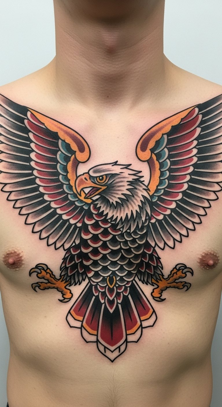 I picked this first because eagles read as strength and freedom and they sit naturally across the sternum and pecs. Traditional linework plays with chest curves so the wings accent collarbones. Expect moderate pain on the pec and longer work time for symmetry. Heals predictably—bold outlines age best. Common mistake: shrinking the design too small for the canvas. Ask for portfolio examples of healed chest pieces and an artist experienced in symmetry.