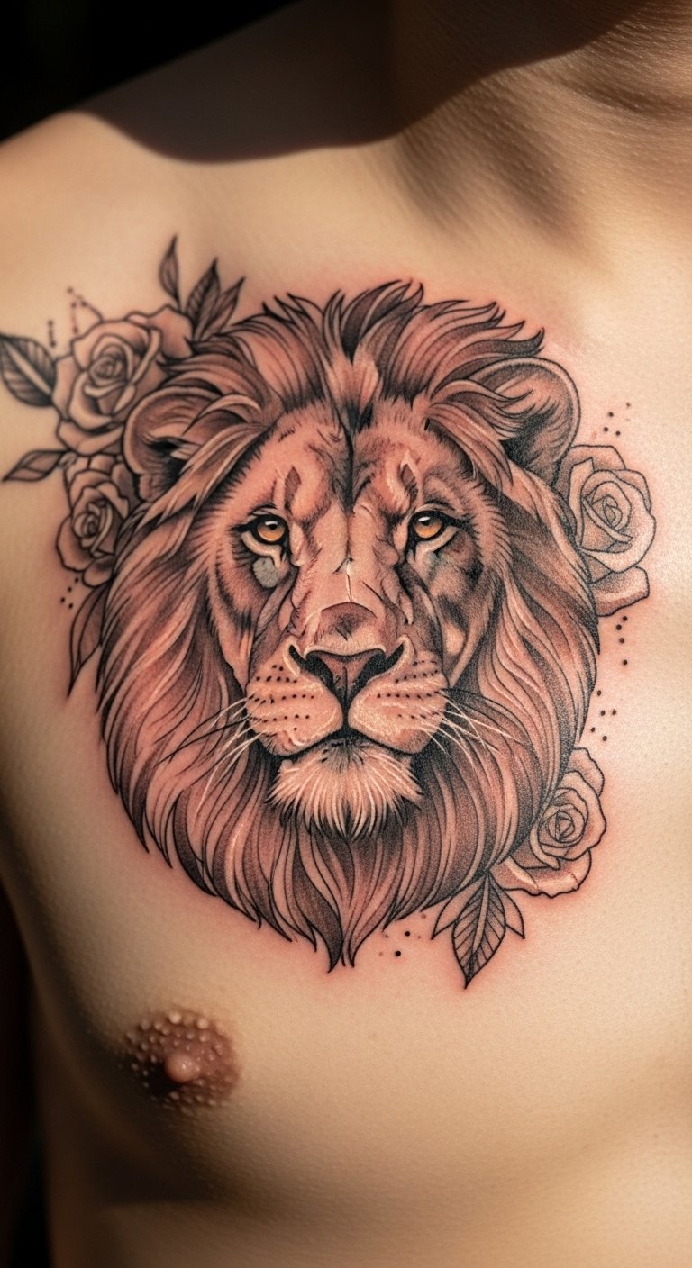 A lion chest tattoo says bravery and command. Placing it on a single pec or centered across the sternum gives different vibes—single pec feels fierce; centered feels regal. Realism needs an artist skilled in skin tone shading and healed examples. Expect longer sessions; healing shows gradual brightening after a few months. Don’t rush color saturation—too bright upfront looks patchy once healed.