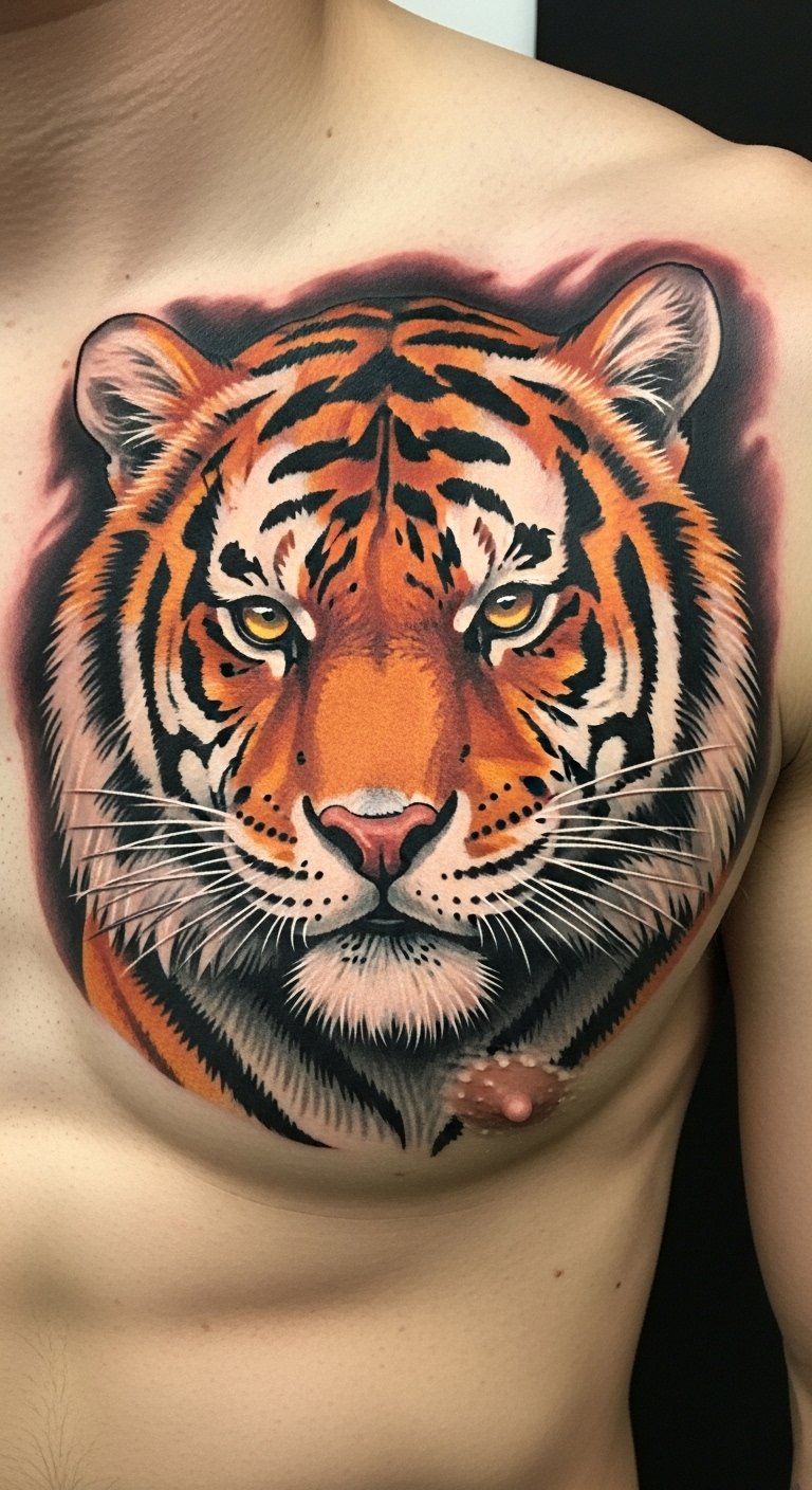 Tiger designs hug chest contours and emphasize strength. Color variants age differently—black/gray stripes hold longer than bright oranges without strong saturation. The trick is letting the tiger’s lines follow muscle movement so it looks alive when you flex. Ask to see healed color work on similar skin tones.