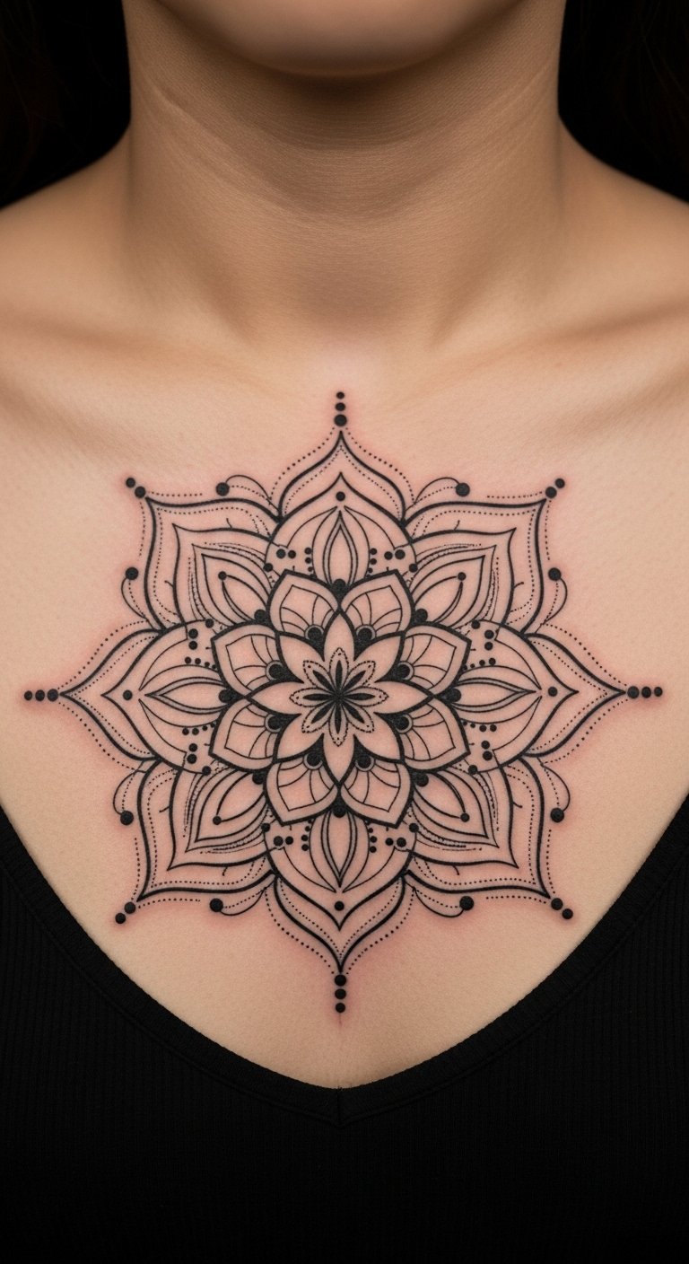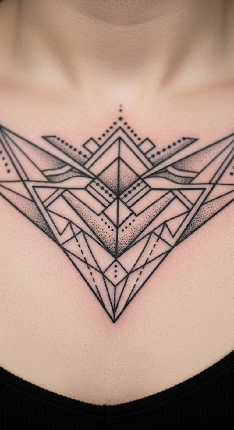 Geometric patterns bring abstract balance to the chest. Symmetry looks deliberate on the sternum area. Precision matters—pick an artist with geometric blackwork healed photos. Pain is moderate; dotwork shading near ribs increases discomfort. The biggest mistake is poor centering—insist on careful stenciling.