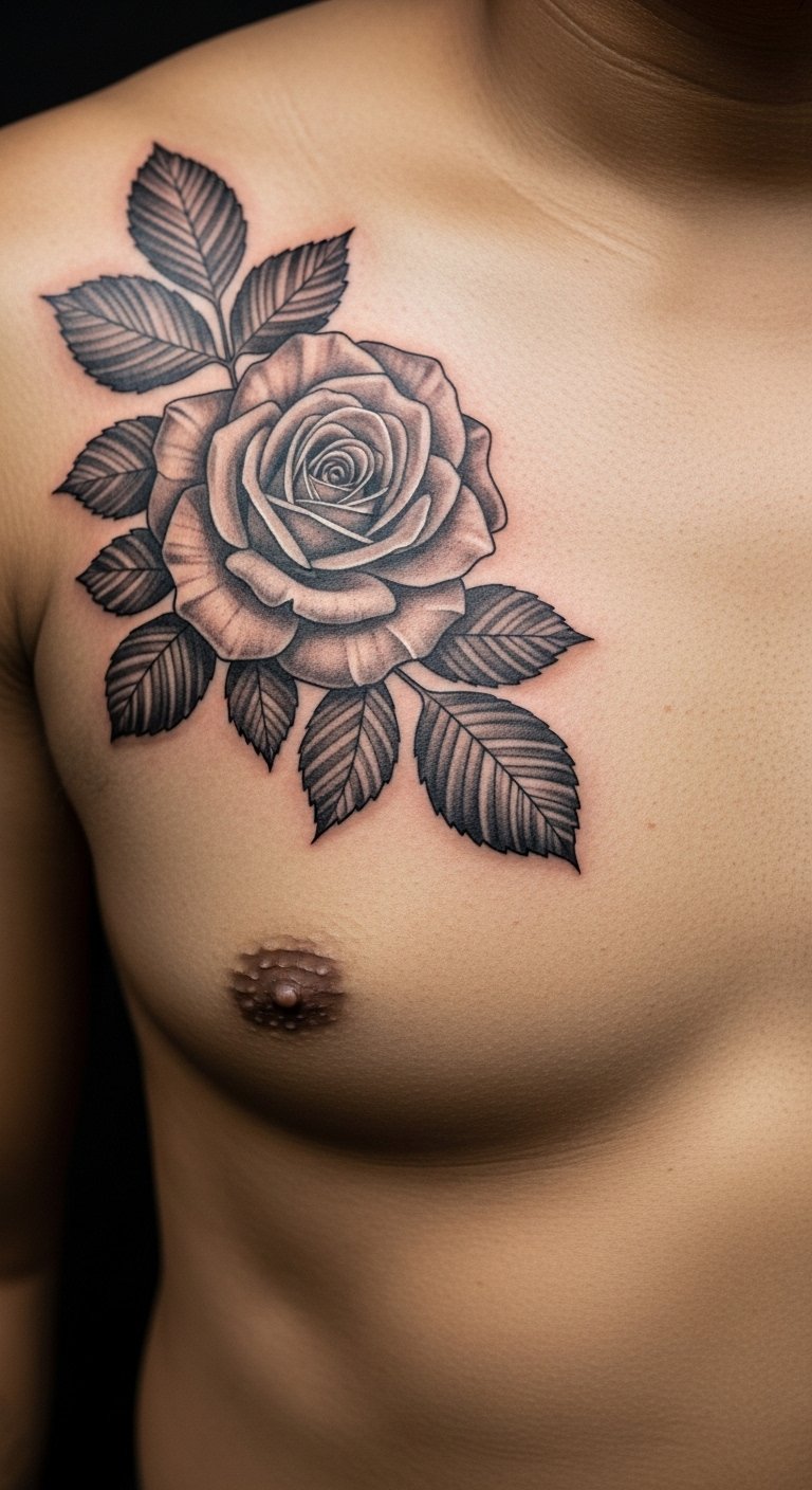 Hyper-detailed flowers on the pec create a lifelike softness against muscular form. Botanical realism pairs well with other chest pieces or as a stand-alone statement. Expect several sessions for shading. Colors may appear muted while healing; they deepen after full recovery. Avoid tiny, hairline veins that can blur—ask for bold petal edges.